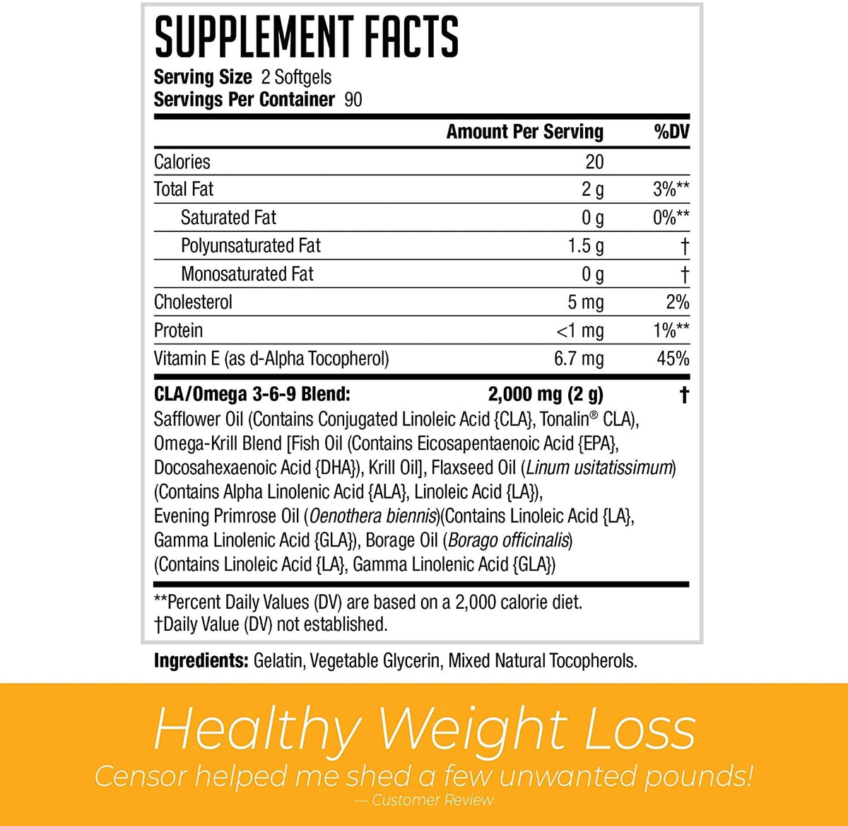 NDS Nutrition Censor - Fat Loss and Body Toner with CLA, Fish Oil, Safflower and Omega 3-6-9 Blend - Dietary Supplement for Improved Energy, Metabolism and Health - 180 Softgels