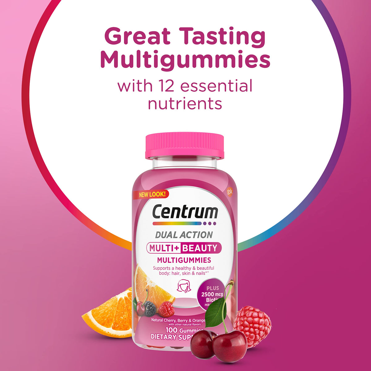 Centrum MultiGummies Multi+ Beauty Dual Action Multivitamin, Specially Designed with Biotin for Healthy Hair, Skin and Nails, Cherry/Berry/Orange Flavors - 100 Count