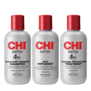 Short Product Description :: Contains 6 fl oz CHI Infra Treatment, 6 fl oz CHI Silk Infusion, 6 fl oz CHI Infra Shampoo
