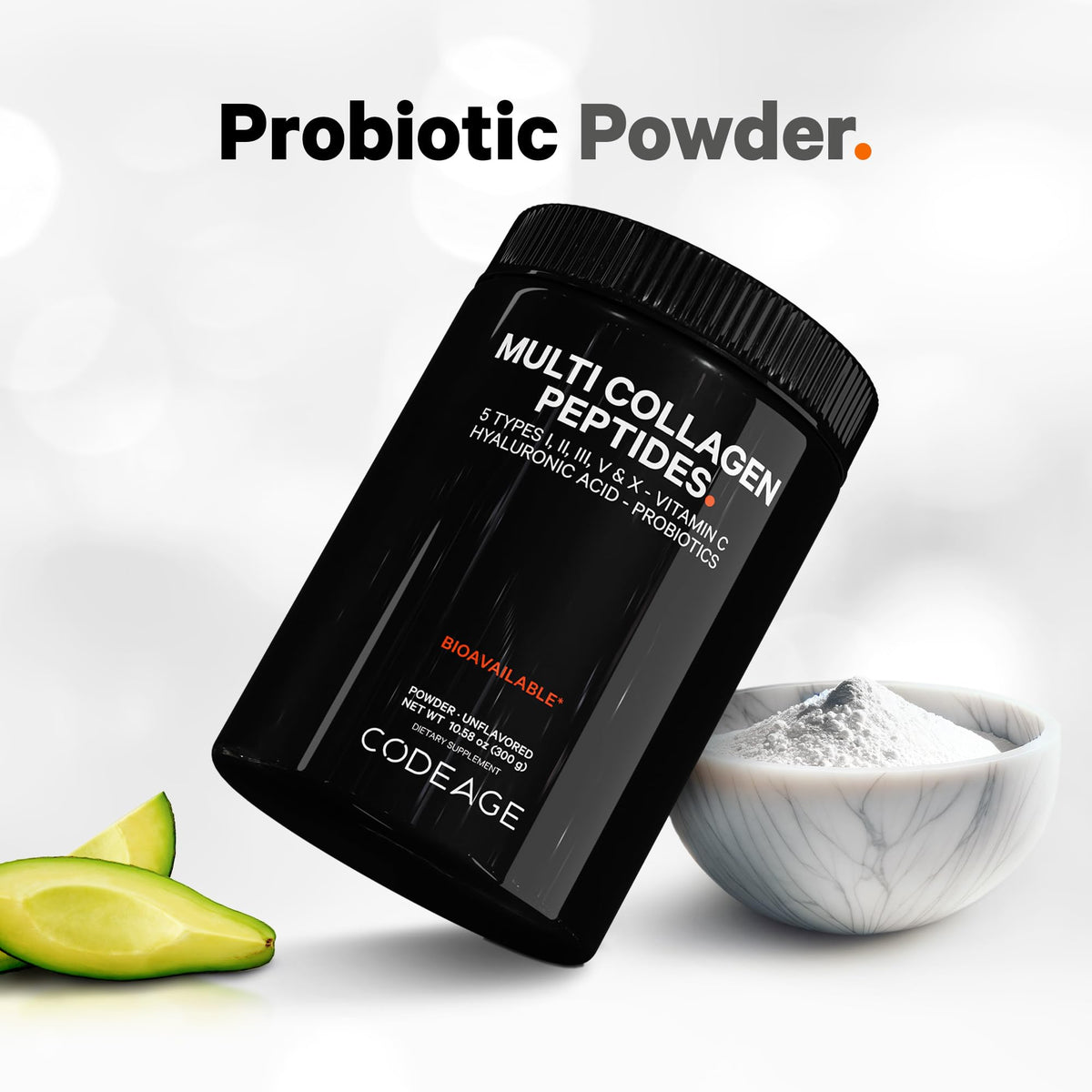 - 5 Types of Collagen with Hyaluronic Acid: Codeage Multi Collagen Peptides Powder Black Edition offers a blend of five collagen types, enhanced with hyaluronic acid, vitamin C, probiotics, and amino acids. Sourced from five different premium collagen sources, this formula provides a comprehensive and convenient collagen supplement in one easy-to-use powder.