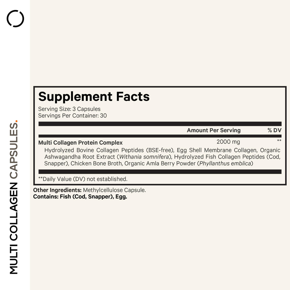 Ingredients :: Hydrolyzed Bovine Collagen Peptides, Eggshell Membrane Collagen, Organic Ashwagandha Extract (root and leaf), Hydrolyzed Fish Collagen Peptides, Chicken Bone Broth Collagen Concentrate, Organic Amal Berry Extract. Other Ingredients: Plant Cellulose