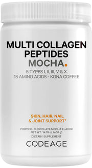 Indulge in the rich flavors of Codeage Multi Collagen Peptides Protein Powder. This chocolate mocha instant coffee blend offers Collagen Type I, II, III, V & X for a gourmet Knoa coffee drink and shake experience, supporting skin, hair, and joint health.