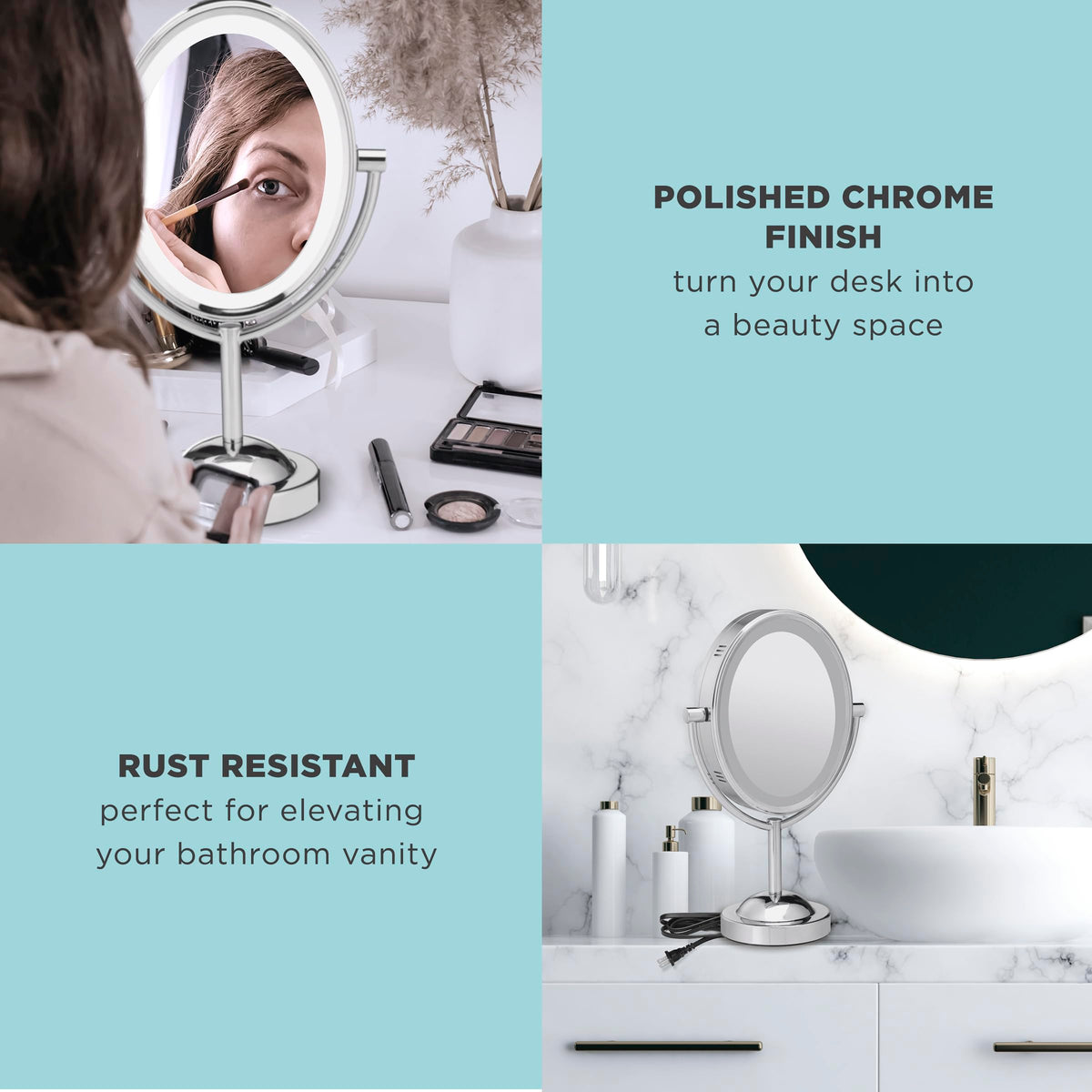 Conair Lighted Makeup Mirror is a double-sided LED vanity mirror with 1X and 7X magnification, perfect for detailed makeup application and grooming tasks in polished chrome finish.