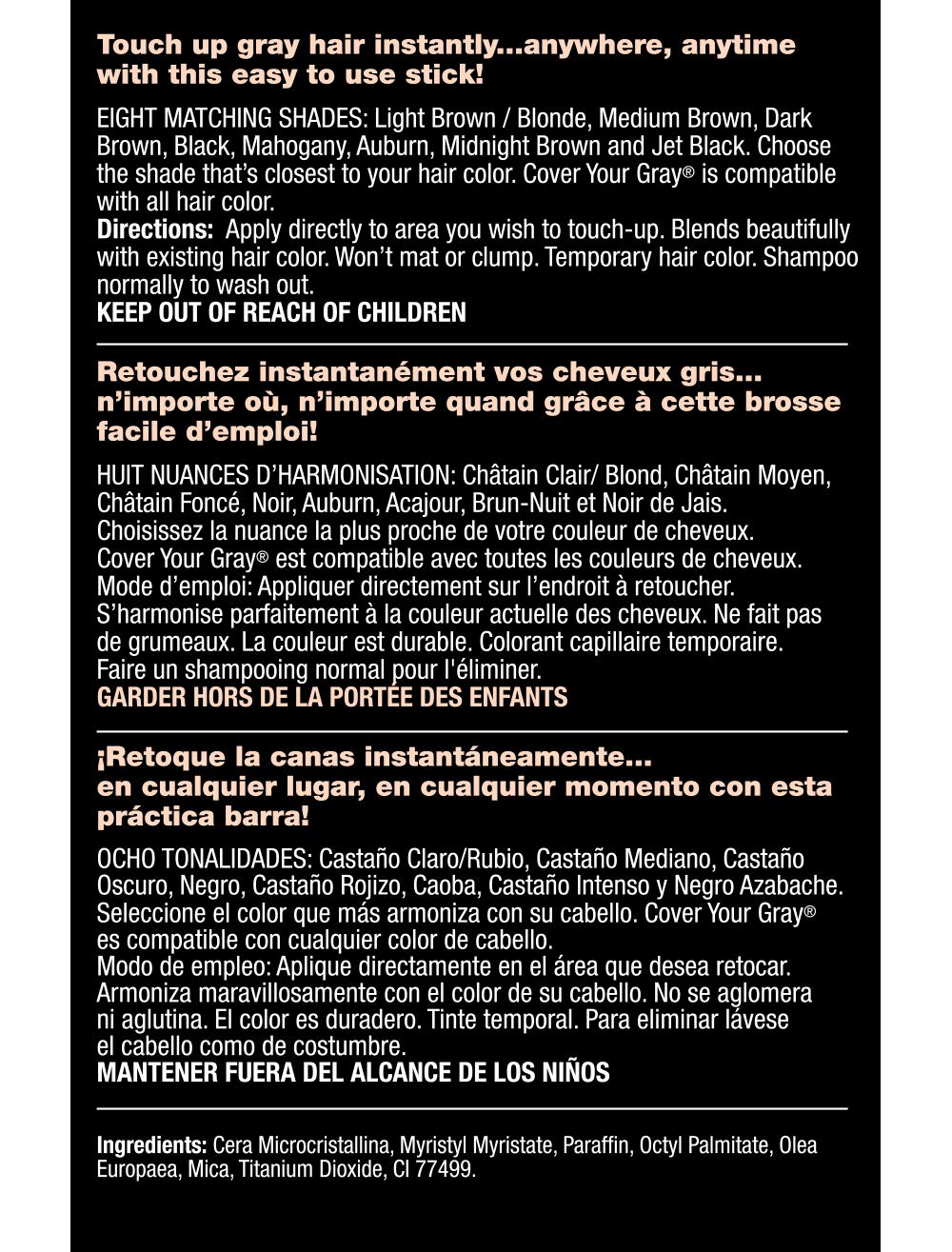 Directions :: Apply directly to area you wish to touch-up. Blends beautifully with existing hair color. Will not mat or clump. Temporary hair color. Shampoo normally to wash out.
