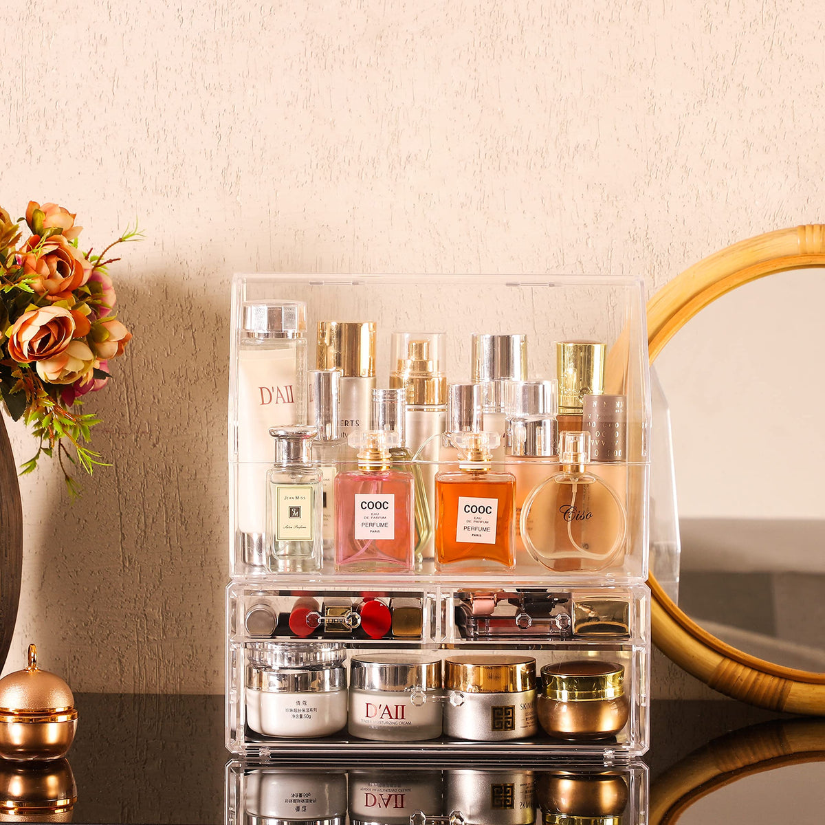 Cq acrylic Makeup Organizer with 3 Drawers -Clear Plastic Skincare and Cosmetic Storage for Vanity Countertop,Dresser Top Organizer for Beauty Products,Cologne Perfume-Bathroom Countertop Organization