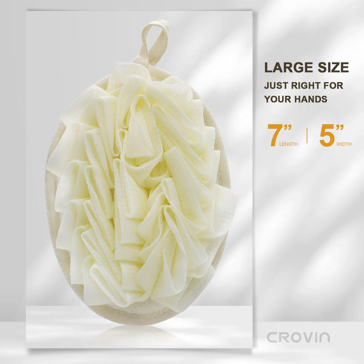 CROVIN Shower Puff 4 Pack Bath Sponge Loofahs are designed for a luxurious bathing experience. The large premium mesh puffs gently exfoliate your skin, leaving it soft and smooth. The elastic hand strap ensures easy handling and thorough cleansing.