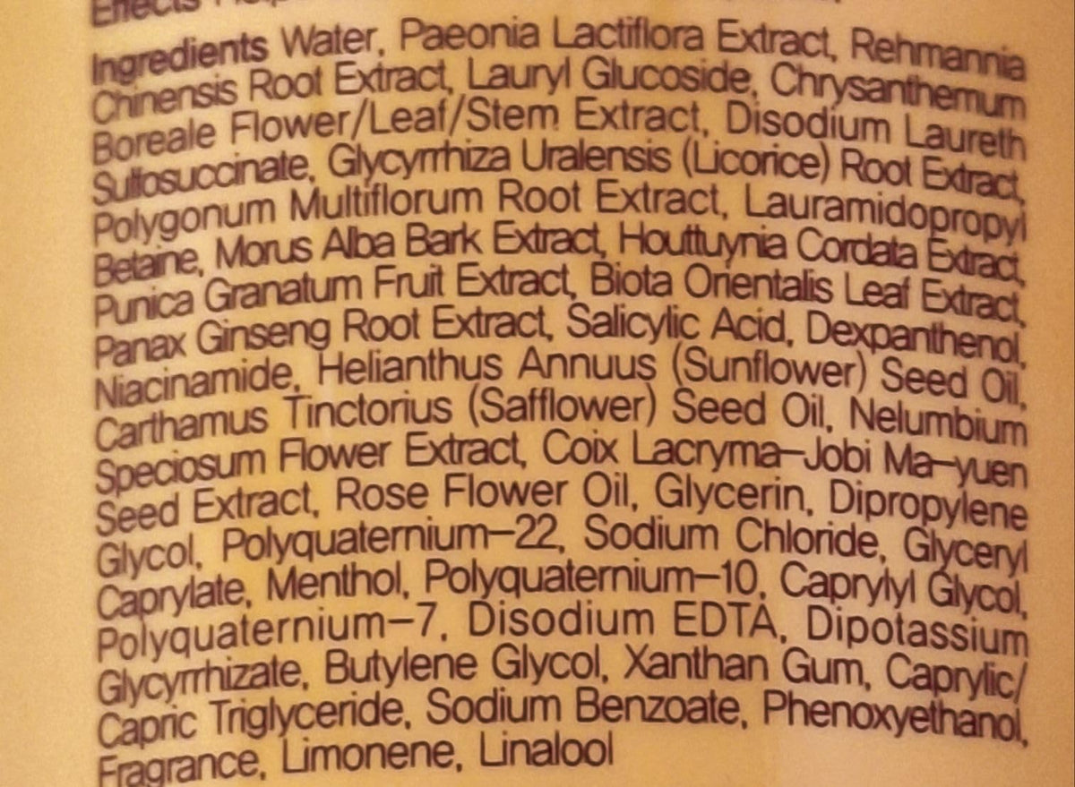 Ingredients :: Water, Paeonia Lactiflora Extract, Rehmannia Chinensis Root Extract, Lauryl Glucoside, Chrysanthemum Boreale Flower/Leaf/Stem Extract, Disodium Laureth Sulfosuccinate, Glycyrrhiza Uralensis (Licorice) Root Extract, Polygonum Multiflorum Root Extract, Lauramidopropyl Betaine, Morus Alba Bark Extract, Houttuynia Cordata Extract, Punica Granatum Fruit Extract, Biota Orientalis Leaf Extract, Panax Ginseng Root Extract, Salicylic Acid, Dexpanthenol, Niacinamide, Helianthus Annuus (Sunflower) Seed Oil, Carthamus Tinctorius (Safflower) Seed Oil, Nelumbium Speciosum Flower Extract, Coix Lacryma-Jobi Ma-yuen Seed Extract, Rose Flower Oil, Glycerin, Dipropylene Glycol, Polyquaternium-22, Sodium Chloride, Glyceryl Caprylate, Menthol, Polyquaternium-10, Caprylyl Glycol, Polyquaternium-7, Disodium EDTA, Dipotassium Glycyrrhizate, Butylene Glycol, Xanthan Gum, Caprylic/Capric Triglyceride, Sodium Benzoate, Phenoxyethanol, Fragrance, Limonene, Linalool