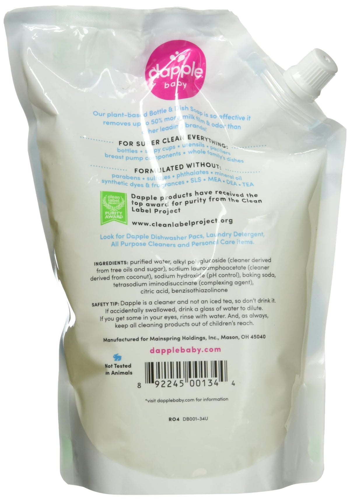 Dapple Refill Pack Baby Bottle and Dish Liquid is a fragrance-free solution in a 33.8 Fluid Ounce bottle, designed to keep your baby's feeding essentials clean and safe.
