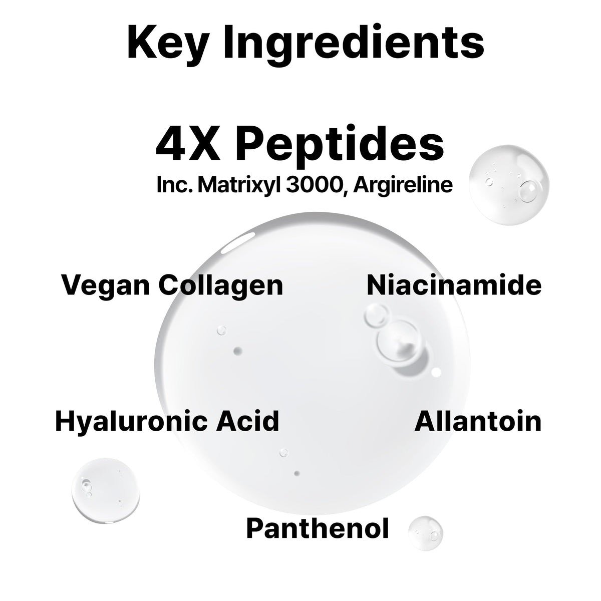 Ingredients: Water, Propanediol, Glycerin, 1,2Hexanediol, Niacinamide, Methylpropanediol, Sodium Hyaluronate, Houttuynia Cordata Extract, Soluble Collagen, Cocos Nucifera Coconut Oil, Simmondsia Chinensis Jojoba Seed Oil, Panthenol, AcrylatesC1030 Alkyl Acrylate Crosspolymer, Tromethamine, Ethylhexylglycerin, Allantoin, Adenosine, Butylene Glycol, Citric Acid, Sodium Phytate, BetaGlucan, Sodium Lactate, Palmitoyl Tripeptide55.5PPM, Polysorbate 20, Tocopherol, Palmitoyl Tripeptide10.1PPM, Palmitoyl Tetrapeptide70.05PPM, Acetyl Hexapeptide80.00005PPM, Xanthan Gum, Carbomer