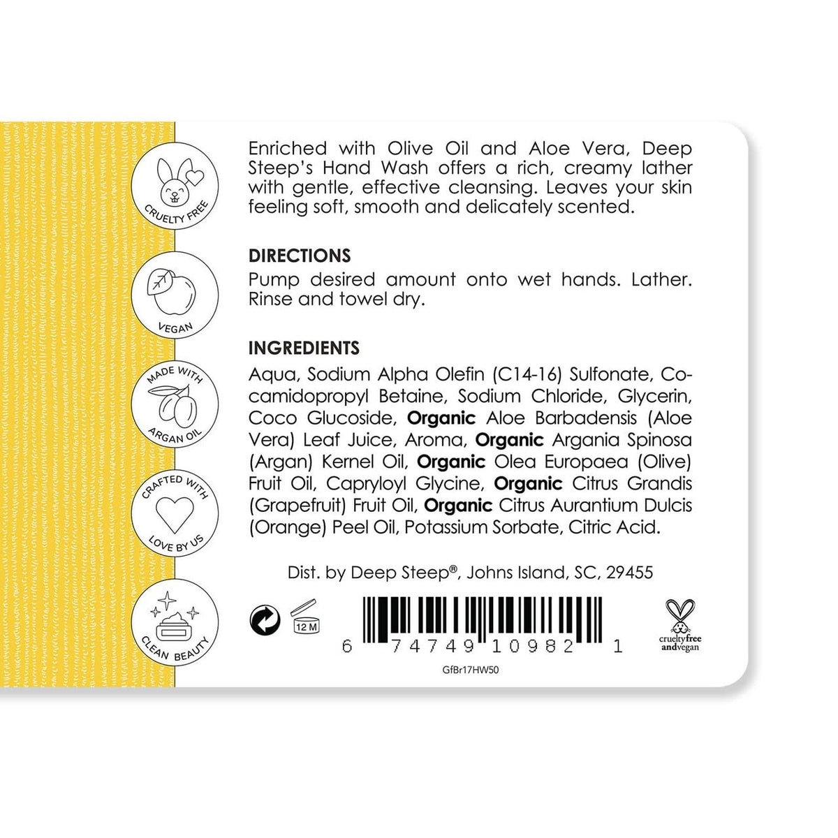 Indulge in the refreshing scent of Deep Steep Argan Oil Liquid Hand Wash in Grapefruit Bergamot. This 17.6 fluid ounce hand wash provides a luxurious cleansing experience with the nourishing benefits of argan oil.