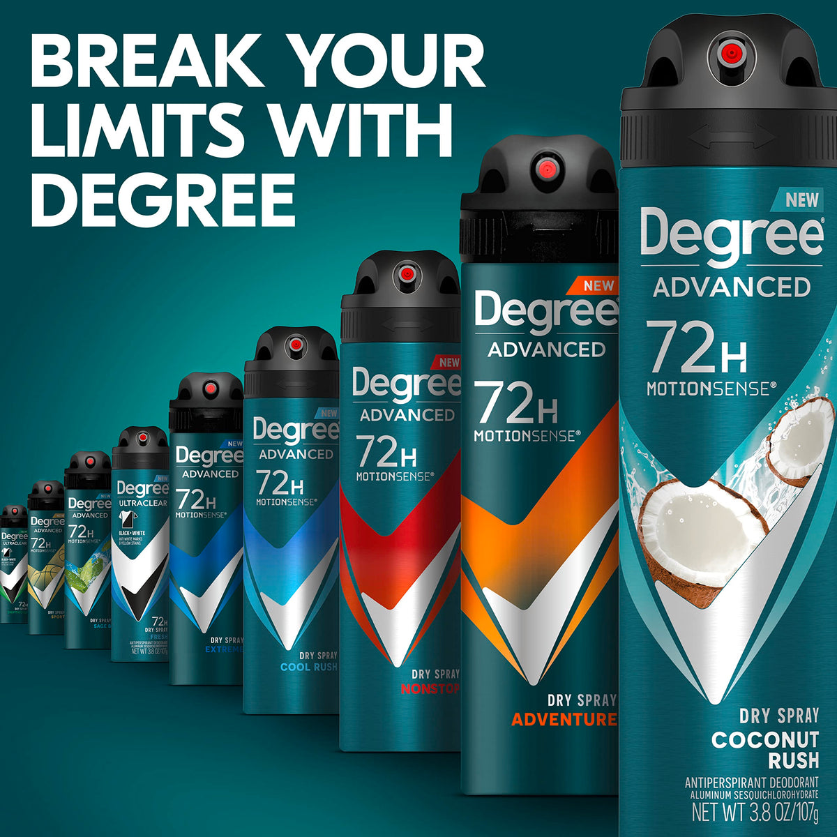 Degree Men Advanced Antiperspirant Deodorant Dry Spray in Coconut Rush offers 72-hour sweat and odor protection with MotionSense Technology. This 3.8 oz deodorant spray is designed for active men on the go.