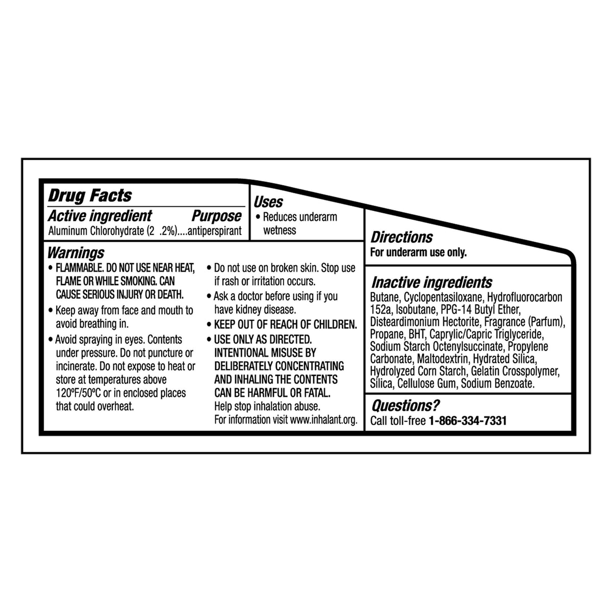 Ingredients: Active Ingredient Aluminum Chlorohydrate 23.3 Inactive Ingredients Butane, Cyclopentasiloxane, Hydrofluorocarbon 152a, Isobutane, PPG14 Butyl Ether, Fragrance Parfum, Disteardimonium Hectorite, Propane, BHT, CaprylicCapric Triglyceride, Sodium Starch Octenylsuccinate, Propylene Carbonate, Maltodextrin, Hydrated Silica, Hydrolyzed Corn Starch, Gelatin Crosspolymer, Silica, Cellulose Gum, Sodium Benzoate