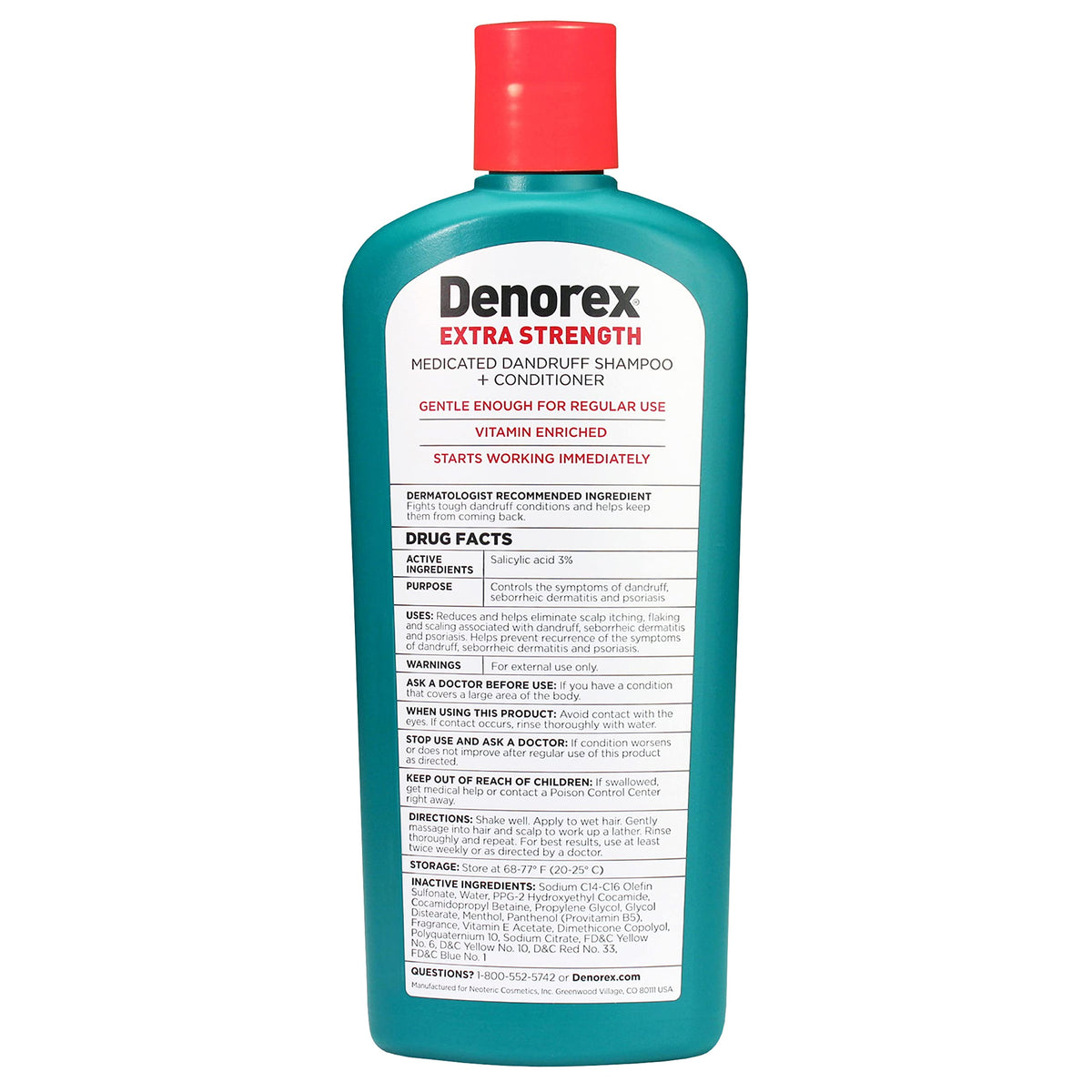 Denorex Extra Strength Anti Dandruff Shampoo & Conditioner Treatment contains 3% Salicylic Acid to relieve moderate symptoms of dandruff, seborrheic dermatitis, and psoriasis. This treatment helps soothe the scalp and improve hair health.