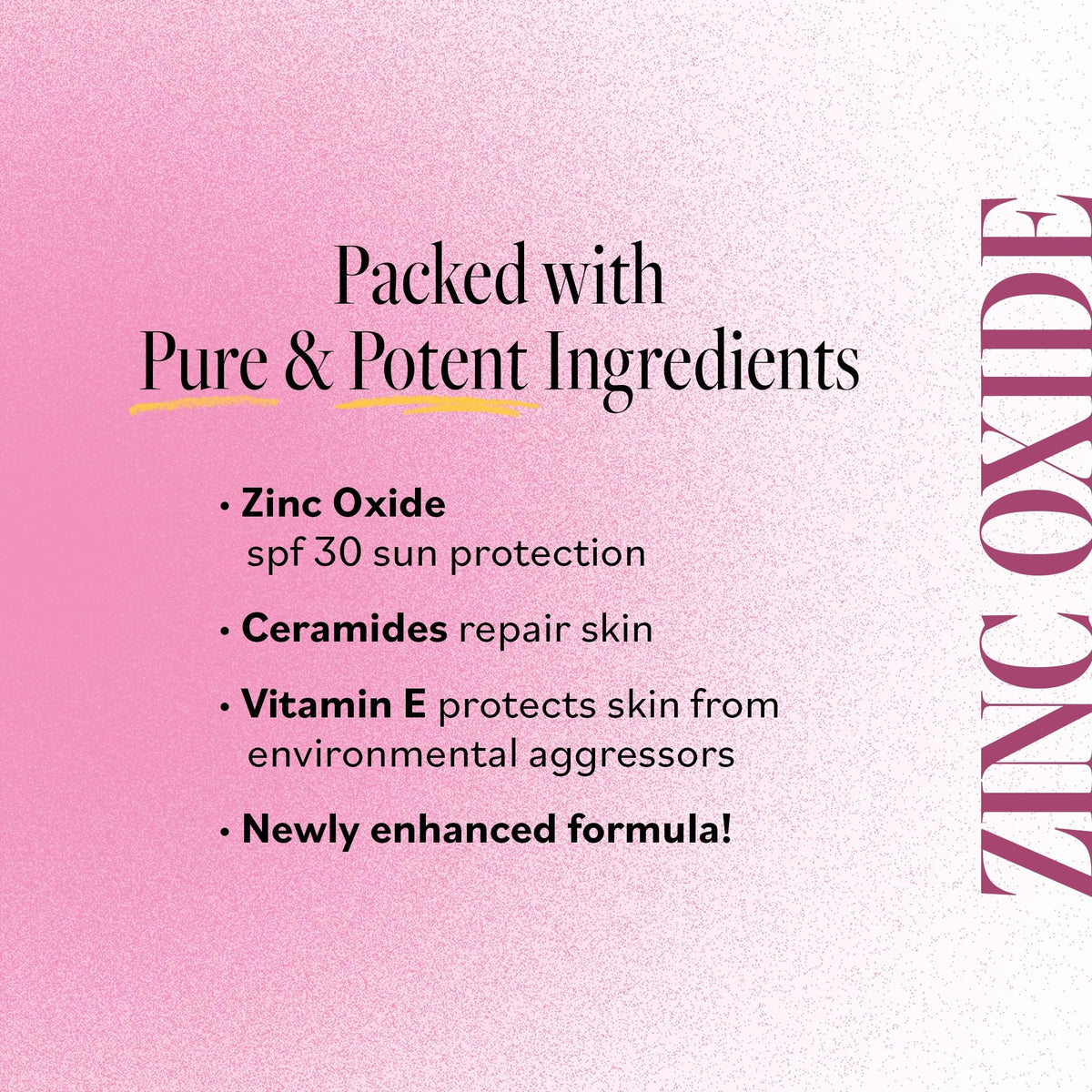 Ingredients: Active Ingredient Zinc Oxide, Ceramides, Vitamin E. Inactive Silica, Mica, Aluminum Starch Octenyl Succinate, Triethoxyoctylsilane, Magnesium Stearate, Stearic Acid, CI 77491, Phenoxyethanol, CI 77492, Bisabolol, Tocopherol, Ethylhexylglycerin, Isostearyl Alcohol, Ceramide NP
