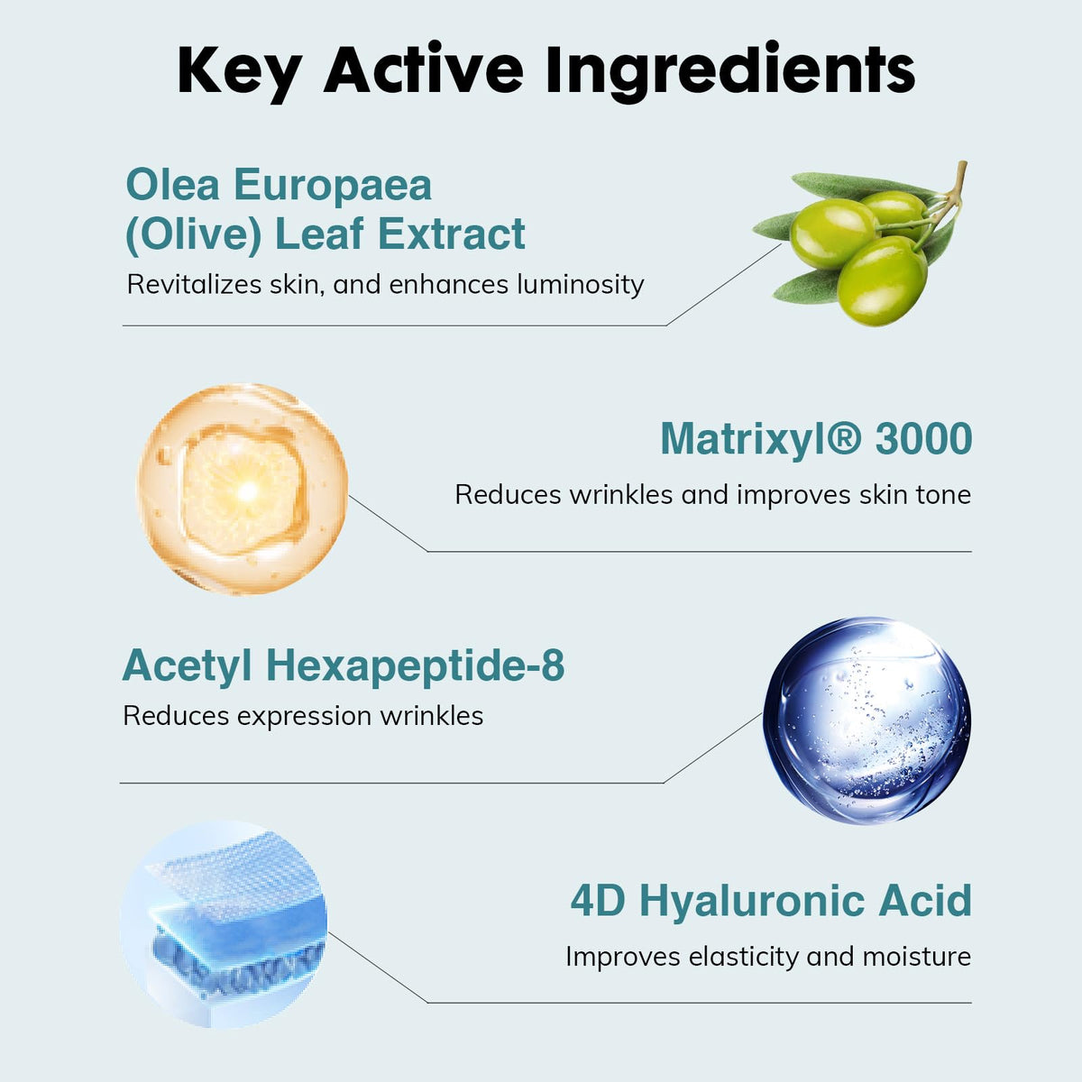 | active ingredients | Olea Europaea Olive Leaf Extract, Matrixyl3000, Hyaluronic Acid |