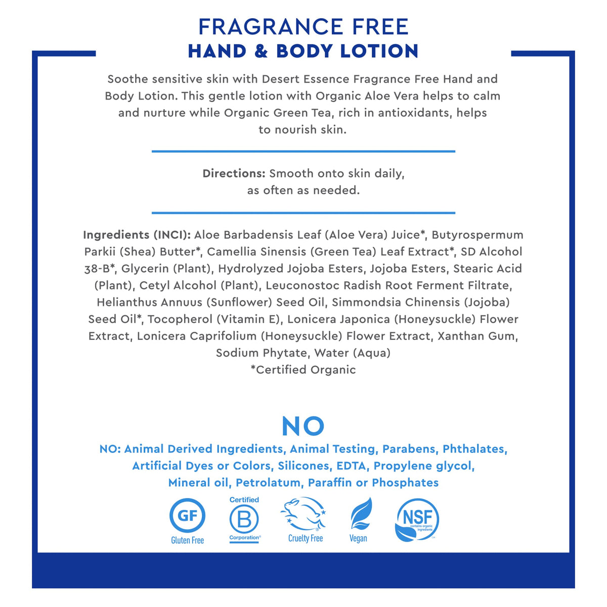 Nourish and soothe your skin with Desert Essence Fragrance Free Hand & Body Lotion. This 8 oz bottle combines natural ingredients for a calming and hydrating experience.