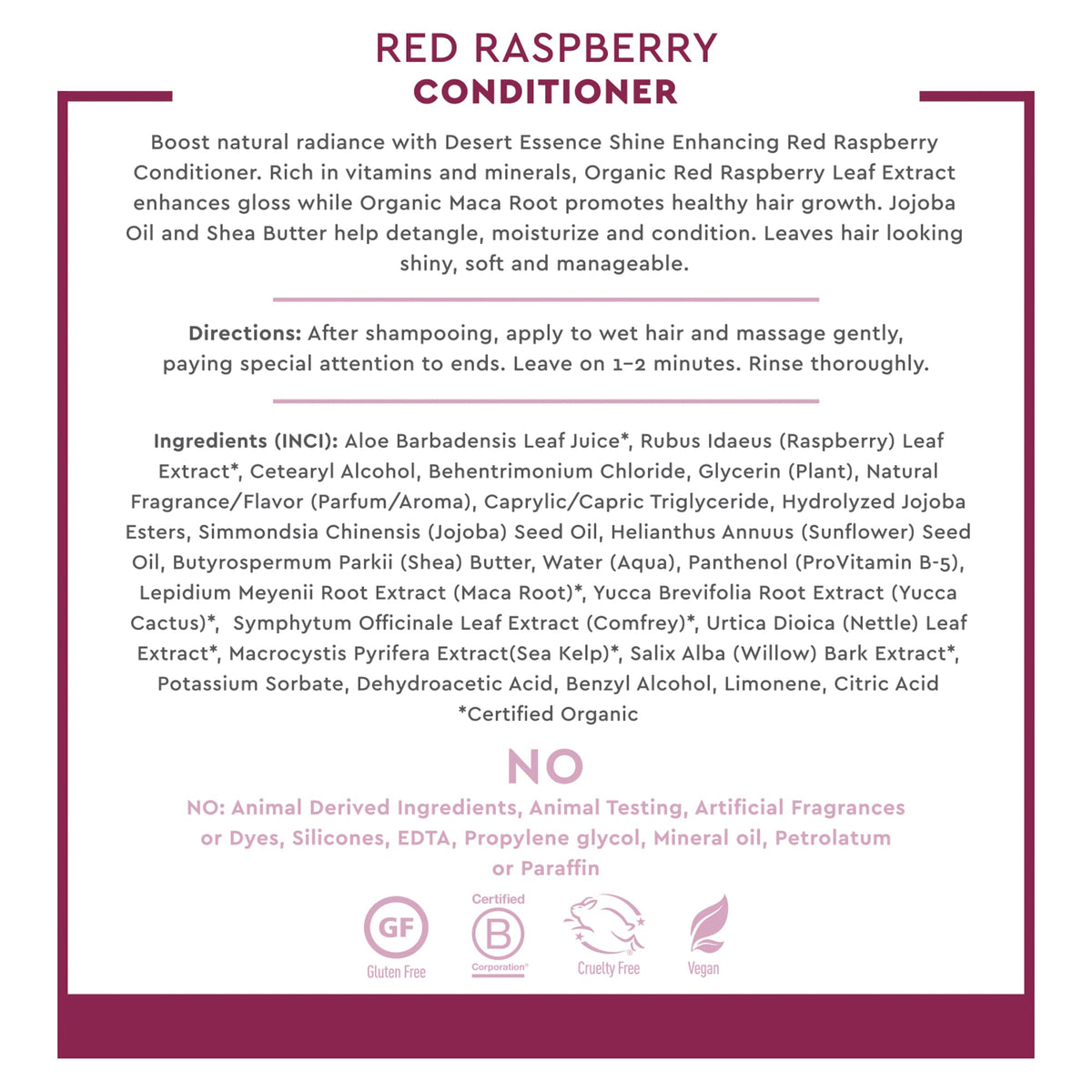 Desert Essence Red Raspberry Conditioner is a shine-enhancing formula enriched with vitamins and botanicals. This smooth and silky conditioner strengthens hair with shea butter, calcium, magnesium, and vitamin B5.