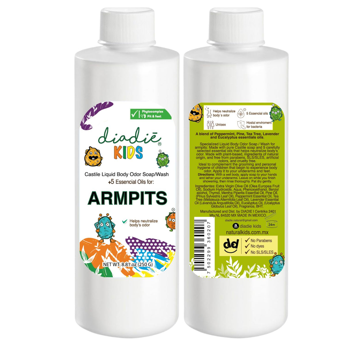 Diadié Kids Natural Castile Liquid Body Odor Soap/Wash, For Armpits, Boys or Girls, Made With 5 Essential Oils, 8.81 oz, 1 Pack