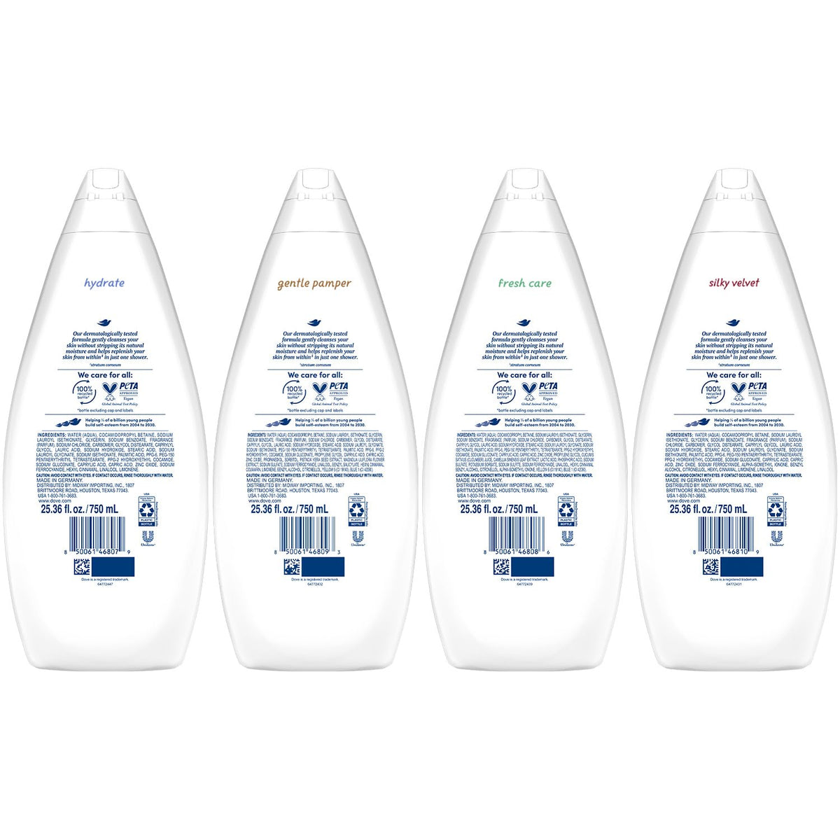 Dove Body Wash Value-Size Variety 6-Pack – Hydrate, Gentle Pamper, Fresh Care, and Silky Velvet, Family Size, 25.36 Oz Ea