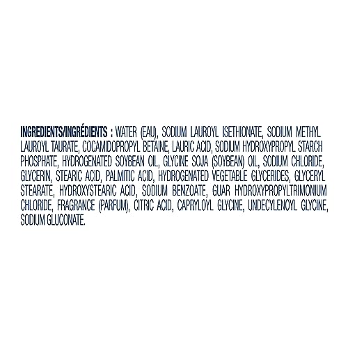 Ingredients: WATER EAU, SODIUM LAUROYL ISETHIONATE, SODIUM METHYL LAUROYL TAURATE, COCAMIDOPROPYL BETAINE, SODIUM HYDROXYPROPYL STARCH PHOSPHATE, LAURIC ACID, HYDROGENATED SOYBEAN OIL, GLYCINE SOJA SOYBEAN OIL, SODIUM CHLORIDE, GLYCERIN, STEARIC ACID, PALMITIC ACID, HYDROWSTEARIC ACID, GLYCERYL STEARATE, SODIUM BENZOATE, GUAR HYDROXYPROPYLTRIMONIUM CHLORIDE, FRAGRANCE PARFUM, UNDECYLENOYL GLYCINE, CAPRYLOYL GLYCINE, CITRIC ACID, SODIUM GLUCONATE.