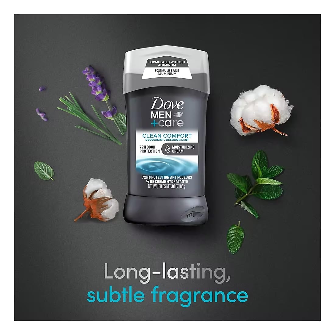 Dove Men+Care 72-Hour Deodorant Stick Aluminum Free in Clean Comfort scent offers long-lasting freshness. This 3-pack of 3 oz. sticks provides reliable odor protection without aluminum, keeping you feeling confident all day.