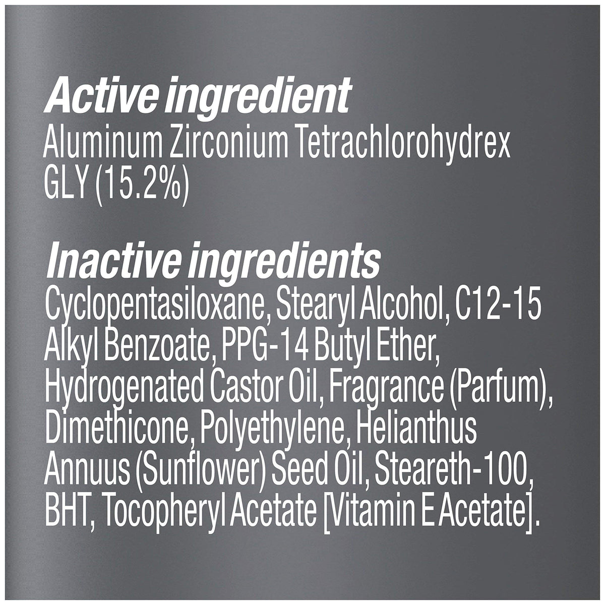 Ingredients: Active Ingredient Aluminum Zirconium Tetrachlorohydrex Gly 15.2 Inactive Ingredients Cyclopentasiloxane, Stearyl Alcohol, C1215 Alkyl Benzoate, PPG14 Butyl Ether, Hydrogenated Castor Oil, Fragrance Parfum, Dimethicone, Polyethylene, Helianthus Annuus Sunflower Seed Oil, Steareth100, BHT, Tocopheryl Acetate