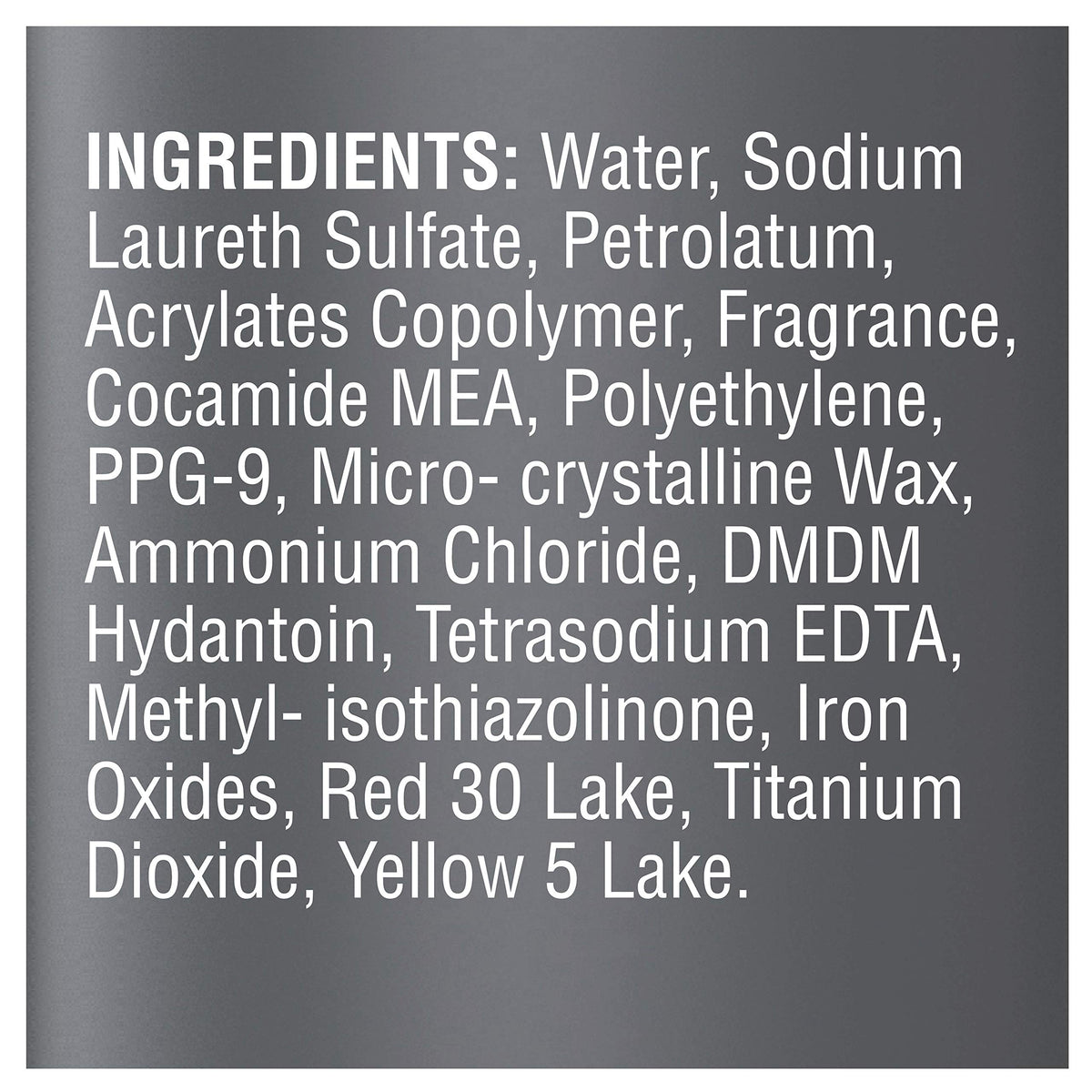 Ingredients: Water Aqua, Sodium Laureth Sulfate, Petrolatum, Acrylates Copolymer, Fragrance Parfum, Cocamide MEA, Hydrated Silica, Ammonium Chloride, Microcrystalline Wax, DMDM Hydantoin, Tetrasodium EDTA, Methylisothiazolinone, PPG9, Iron Oxides CI 77499, Yellow 5 Lake CI 19140, Titanium Dioxide CI 77891, Red 30 Lake CI 73360