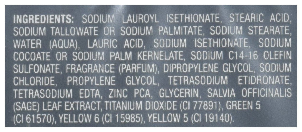 Ingredients: Sodium Lauroyl Isethionate, Stearic Acid, Sodium Tallowate or Sodium Palmitate, Sodium Stearate, Water Aqua, Lauric Acid, Sodium Isethionate, Sodium Cocoate or Sodium Palm Kernelate, Sodium C1416 Olefin Sulfonate, Fragrance Parfum, Dipropylene Glycol, Sodium Chloride, Propylene Glycol, Sodium Chloride, Propylene Glycol, Tetrasodium Etidronate, Tetrasodium EDTA, Zinc PCA, Glycerin, Salvia Officinalis Sage Leaf Extract, Titanium Dioxide CI 77891, Green 5 CI 61570, Yellow 6 CI 15985, Yellow 5 CI 19140