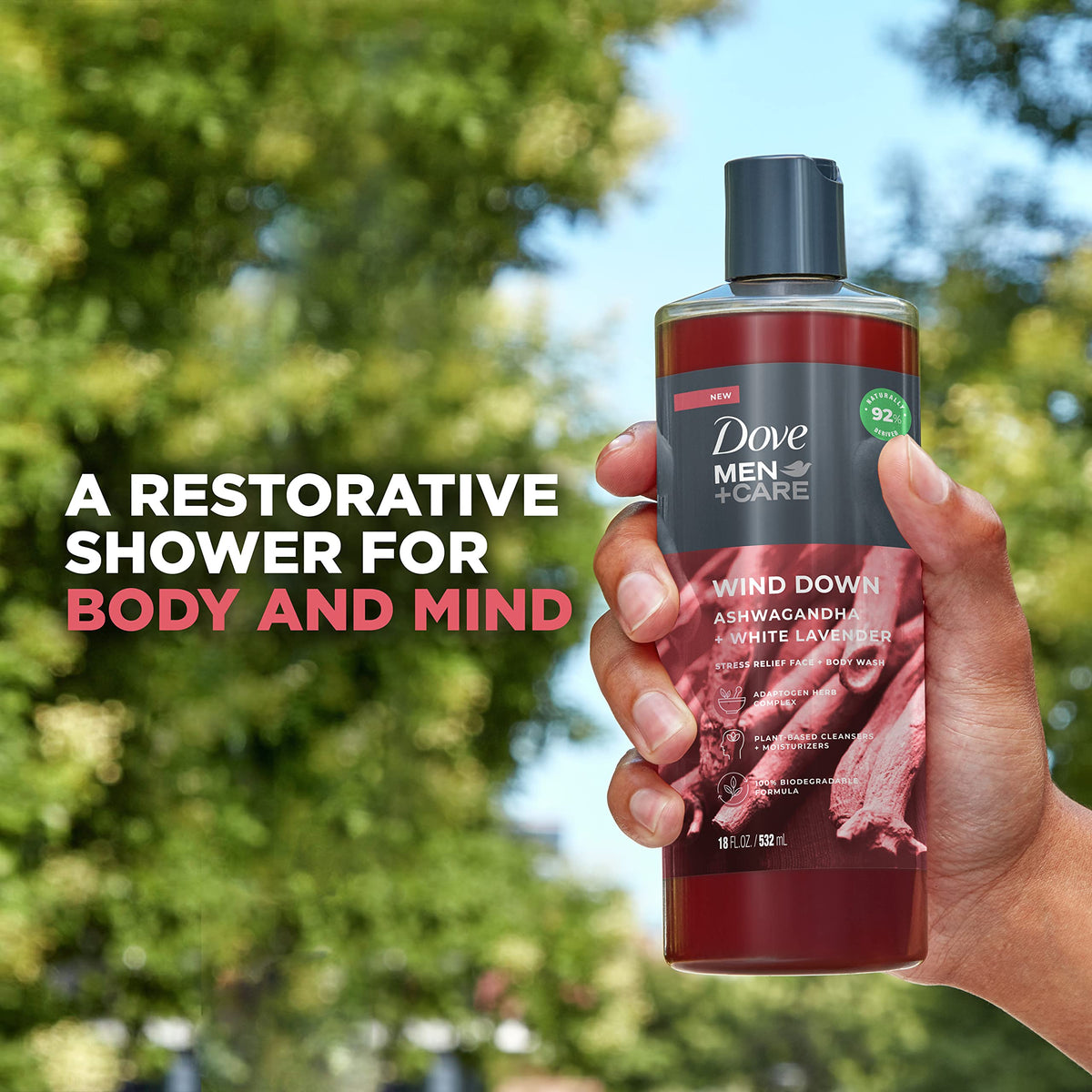 Indulge in relaxation with DOVE MEN + CARE Face + Body Wash. Infused with Ashwagandha and White Lavender, this wash provides a calming experience, perfect for winding down after a long day.