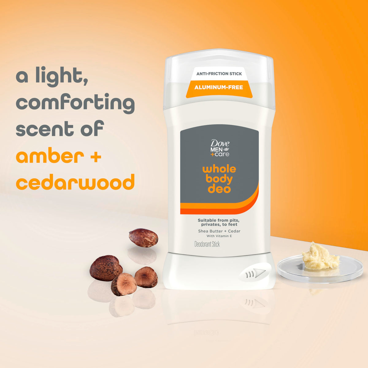 Dove Men+Care Whole Body Deodorant Shea Butter & Cedar For 72H Odor Protection from pits, privates, to feet 3 oz