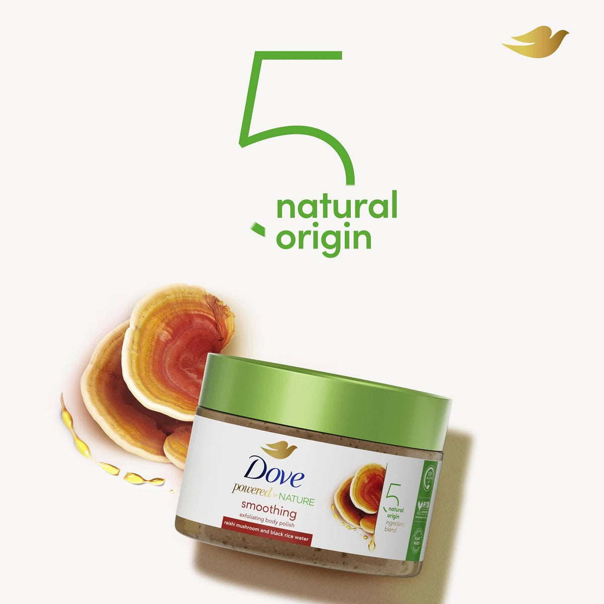 Experience the natural goodness with Dove Powered By Nature Smoothing Body Polish. This exfoliating blend of 5 natural origin ingredients revitalizes your skin, leaving it smooth and radiant.