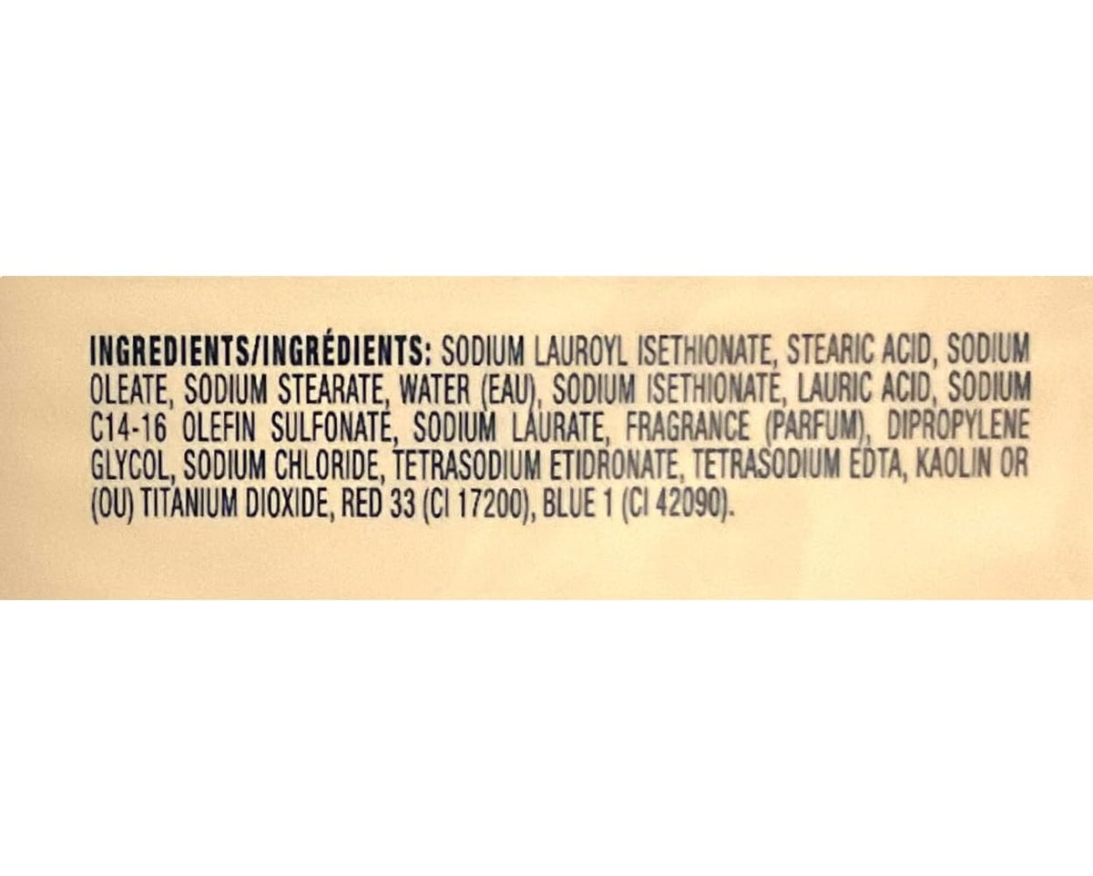 Ingredients: Sodium Lauroyl Isethionate, Stearic Acid, Sodium Oleate, Sodium Stearate, Water Eau, Sodium Isethionate, Lauric Acid, Sodium C1416 Olefin Sulfonate, Sodium Laurate, Fragrance Parfum, Dipropylene Glycol, Sodium Chloride, Tetrasodium Etidronate, Tetrasodium EDTA, Kaolin or ou Titanium Dioxide, Red 33 CI 17200, Blue 1 CI 42090.
