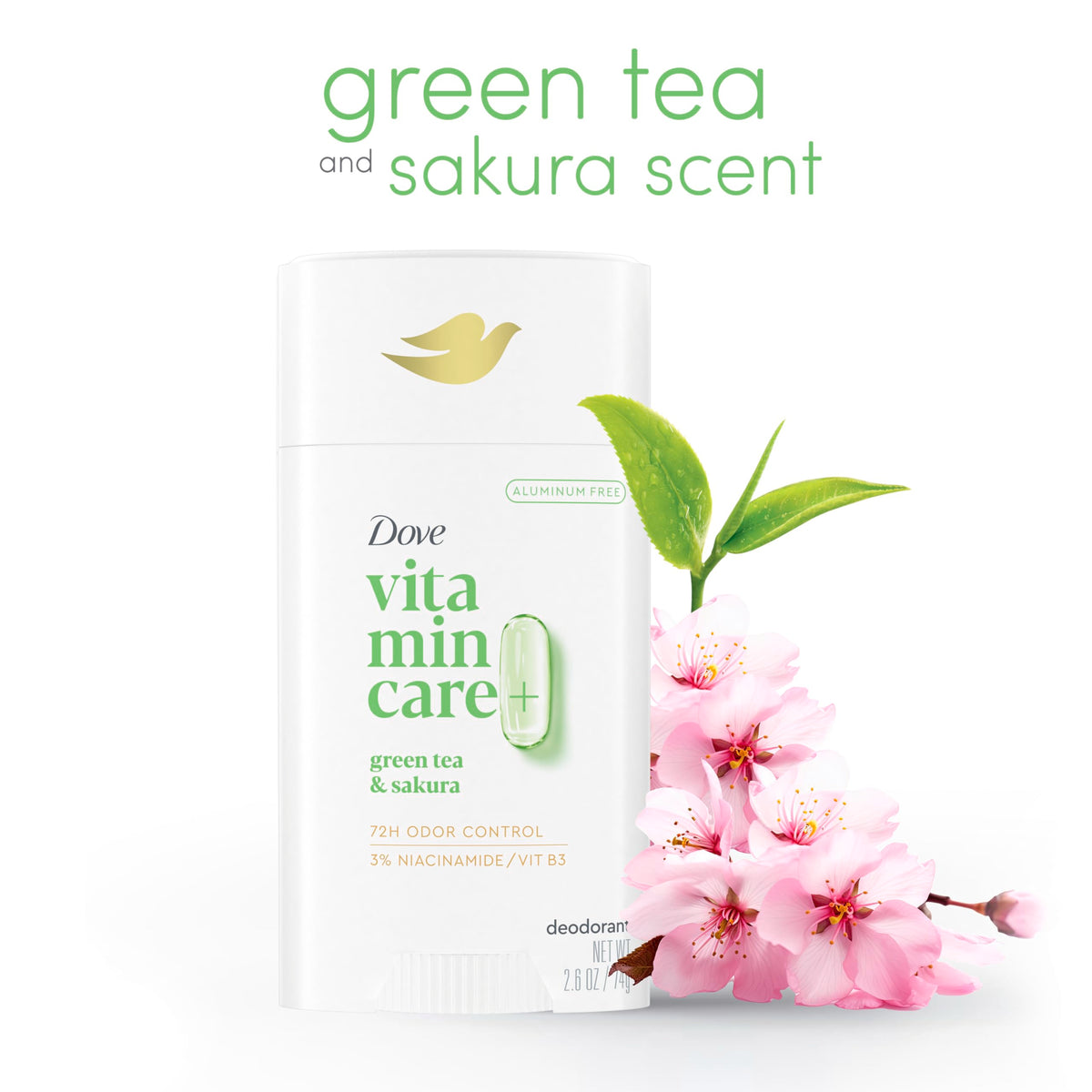 Dove VitaminCare+ Deodorant Stick in Green Tea & Shakura scent is an aluminum-free formula that offers 2.6 oz. of protection. Infused with vitamin care, this deodorant provides long-lasting freshness and odor control.