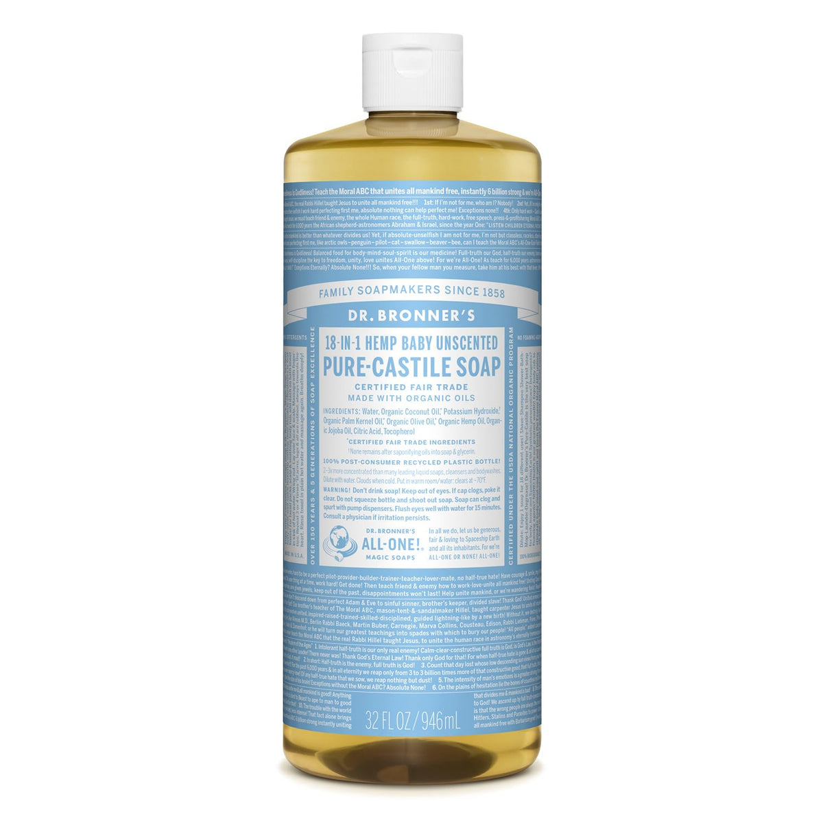 Dr. Bronner's - Pure-Castile Liquid Soap (Baby Unscented, 32 ounce, 2-Pack) - Made with Organic Oils, 18-in-1 Uses: Face, Hair, Laundry and Dishes, For Sensitive Skin and Babies, No Added Fragrance