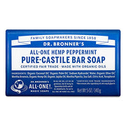 Dr. Bronner's Pure-Castile Bar Soap in Peppermint is a versatile soap made with organic oils for face, body, and hair. This gentle and moisturizing soap is biodegradable, vegan, and cruelty-free, providing a refreshing and invigorating cleansing experience.