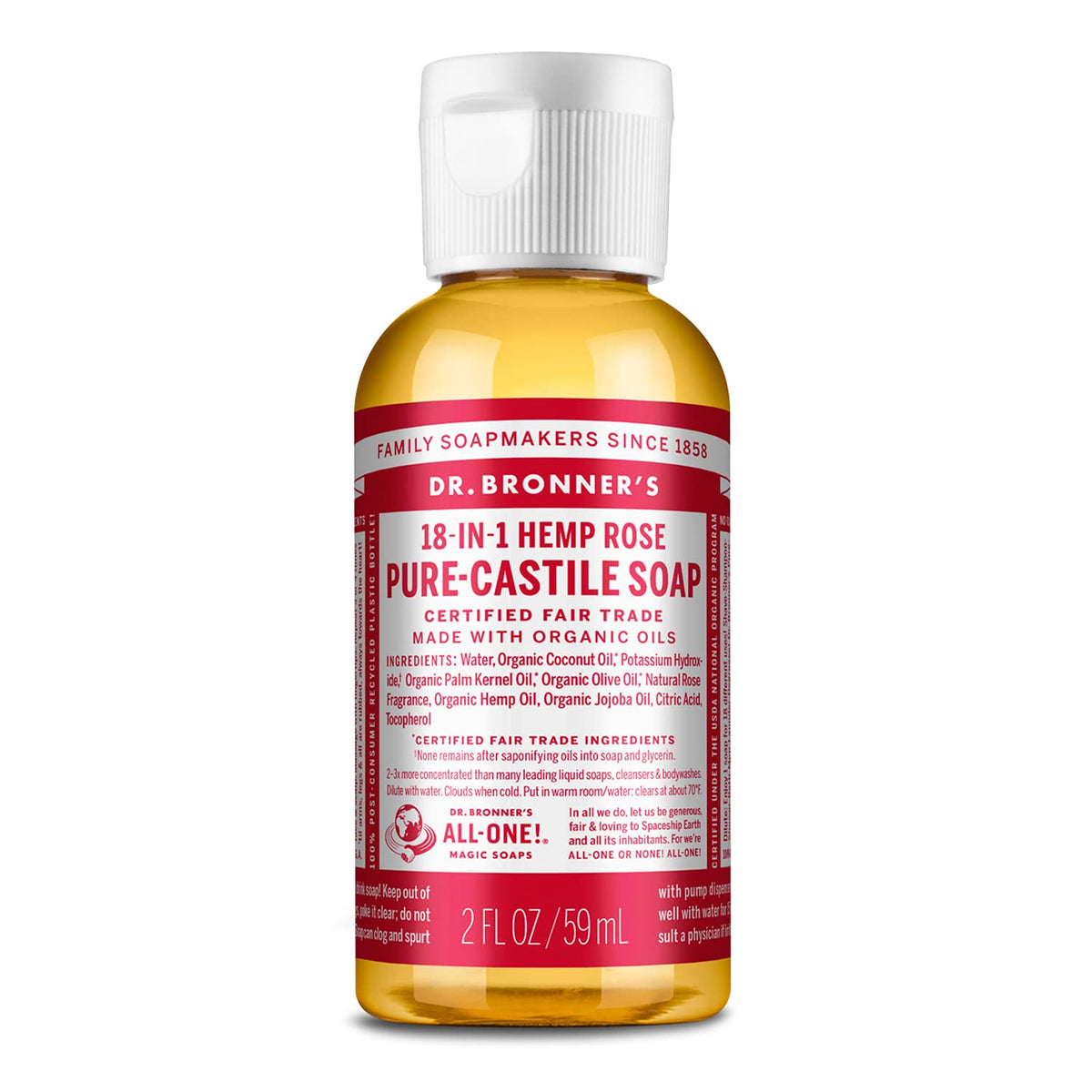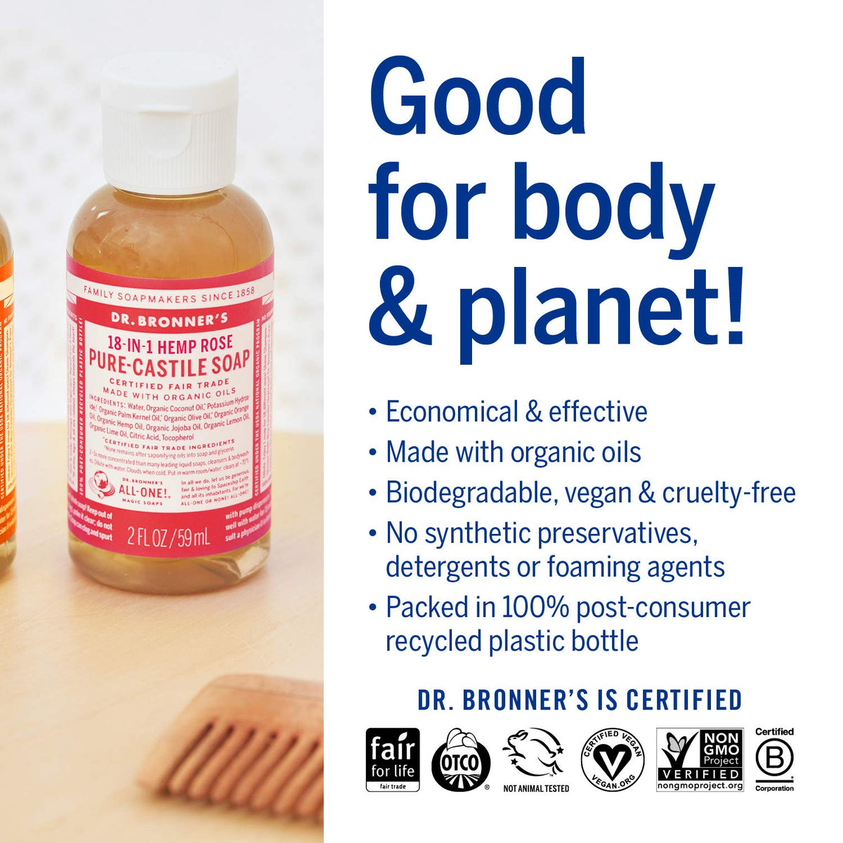 Discover the versatility of Dr. Bronner's Pure-Castile Liquid Soap in Rose scent. Made with organic oils, this multi-use soap offers 18-in-1 benefits for face, body, hair, laundry, pets, and dishes, providing a sustainable and vegan cleaning solution.