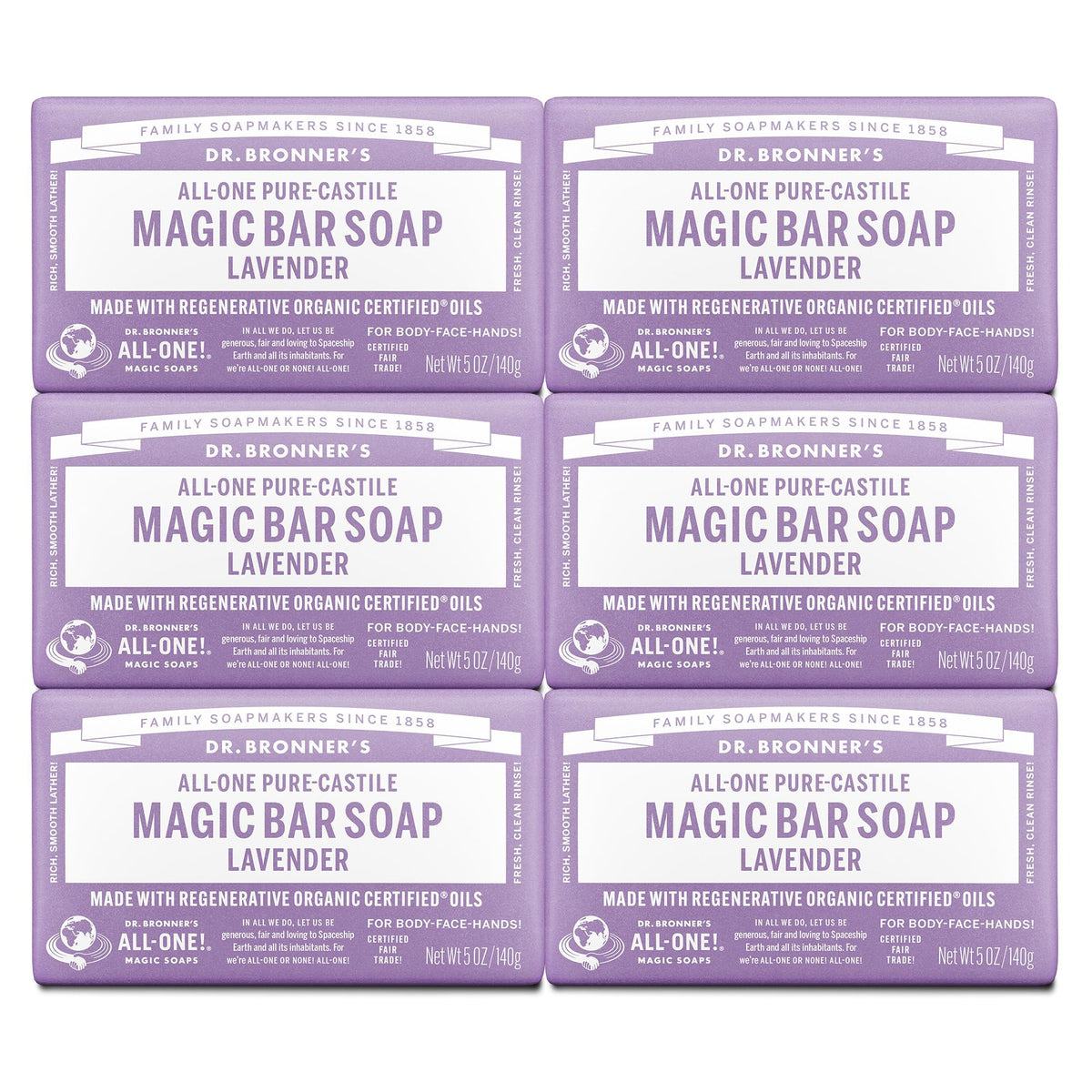 Dr. Bronner's Pure-Castile Magic Soap Bars (Lavender, 5 oz, 6-Pack)- Bath Soap with Regenerative Organic Certified Oils- For Face, Body & Hair - Gentle, Biodegradable, Vegan- Bar Soaps for Men & Women