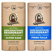 Dr. Squatch Natural Deodorant for Men is an aluminum-free deodorant that effectively eliminates odors. This 2.65 oz, 2-pack product in Alpine Sage and Fresh Falls scents keeps you fresh and confident throughout the day without harsh chemicals.