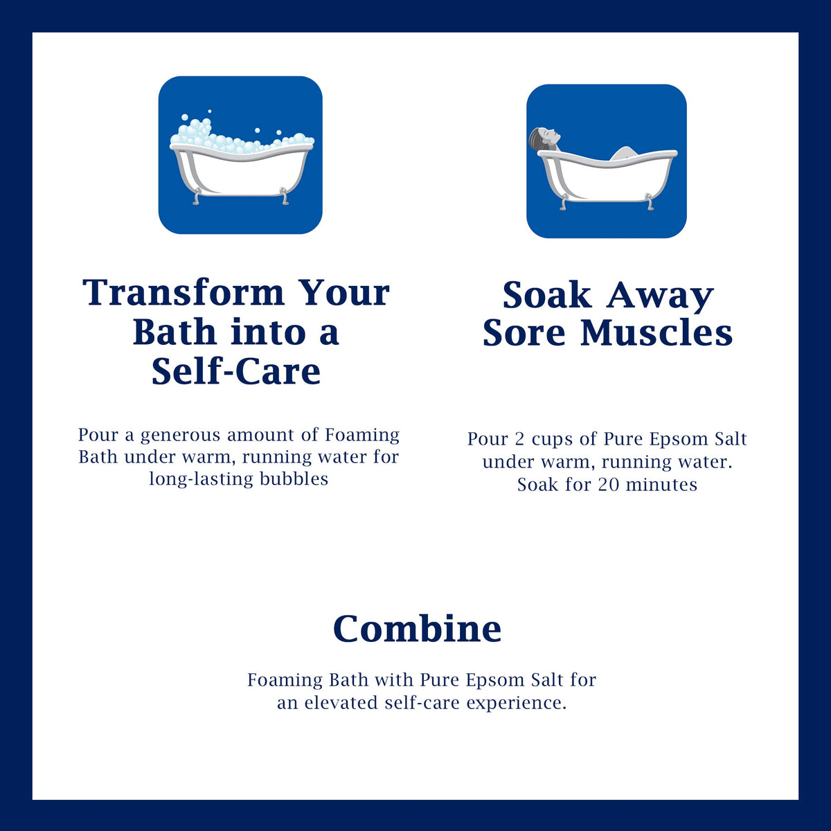 Directions :: To use the product, fill your bathtub with water, add 2 cups of Dr Teal's Epsom Salt, and run Dr Teal's foaming bath under the running water for a relaxing bubble bath experience.
