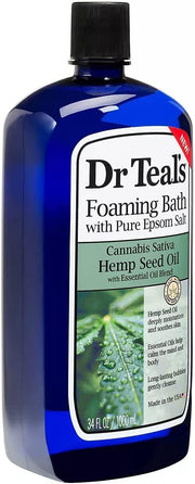 Dr Teal's Hemp Seed Oil Foaming Bath is a luxurious blend of Cannabis Sativa Hemp Seed Oil and essential oils mixed with pure Epsom Salt. This 34oz bottle offers a relaxing bath experience that eases aches and pains while deeply moisturizing your skin, leaving it soft and rejuvenated.