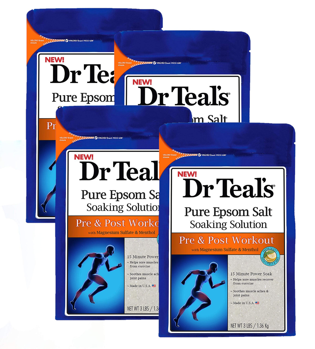 Dr. Teals Pre & Post Workout Epsom Salt Soaking Solution (4 Pack, 3lbs Ea.) - Essential Oils Blended with Pure Epsom Salt & Menthol - Eases Aches & Soreness, Alleviates Daily Stress - At Home Recovery