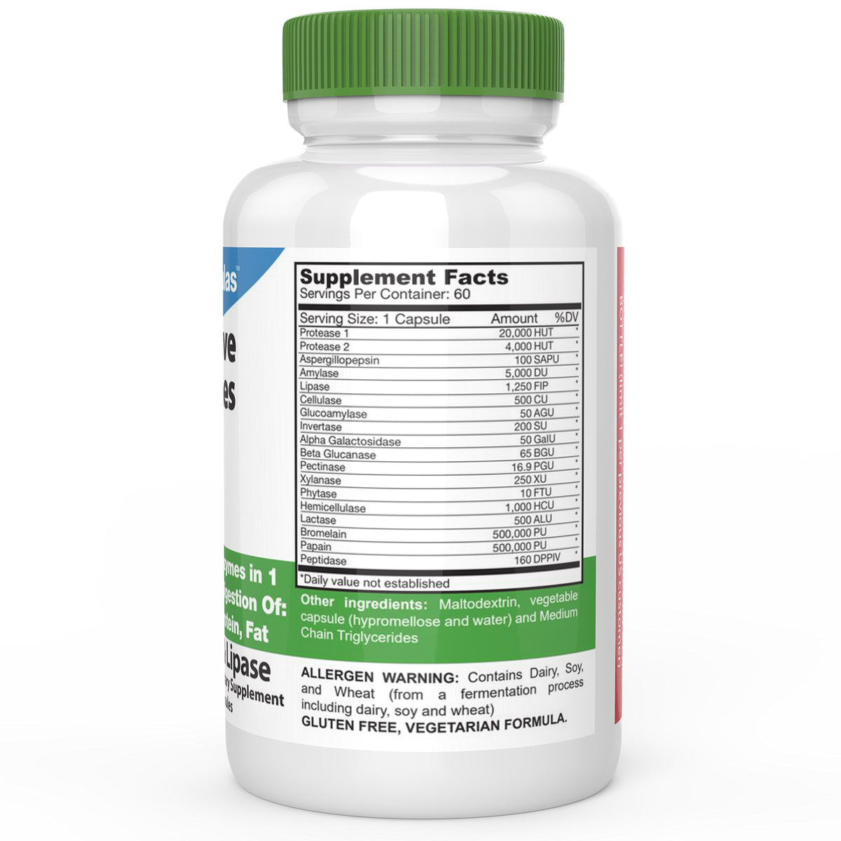 Ingredients: Protease, Amylase, Lipase, Cellulase, Glucoamylase, Invertase, Catalase, Betaglucanase, Pectinase, Xylanase, Phytase, Hemicellulase, Bromelain, Papain, Galactosidase, and Lactase
