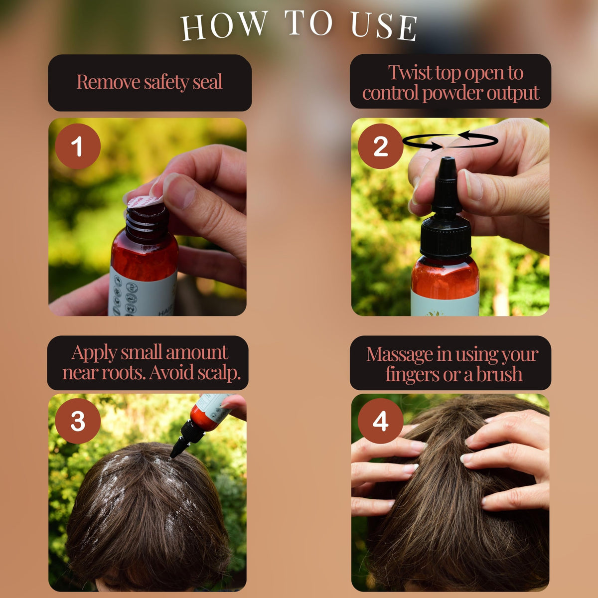 Twist the top part of the cap open, shake out the powder directly to the roots, or apply a small amount to your fingertips first and run your fingers through the areas that need attention. In case if too much of the product is used and hair or scalp appears white, leave it in for several more minutes and then rub it again.