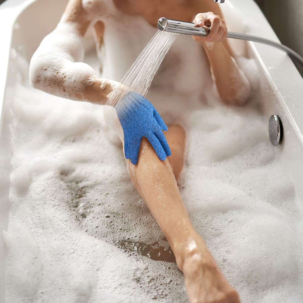 1. Wet the exfoliating gloves. 2. Apply body wash or soap to the gloves. 3. Gently rub the gloves on the skin to exfoliate and clean the body. 4. Avoid using the gloves on the face. 5. Rinse the gloves and let them dry, but do not isolate them under the sun.