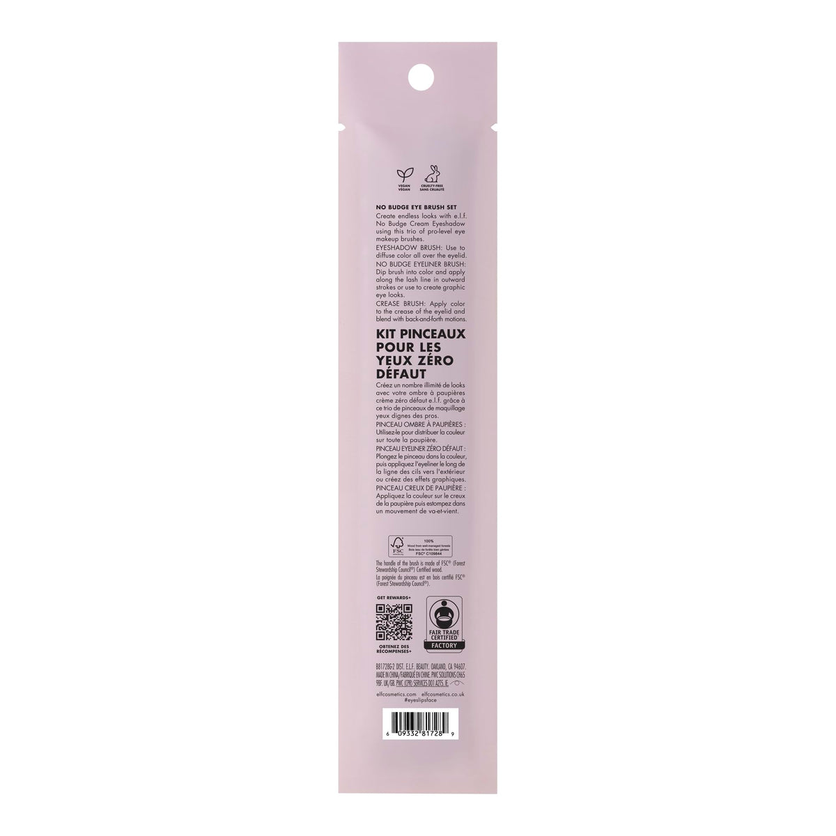 e.l.f. No Budge Brush Trio is a 3-piece eyeshadow brush set for applying and blending color effortlessly. Designed for use with the No Budge Cream Eyeshadows, these vegan and cruelty-free brushes ensure a seamless and long-lasting eye makeup application.