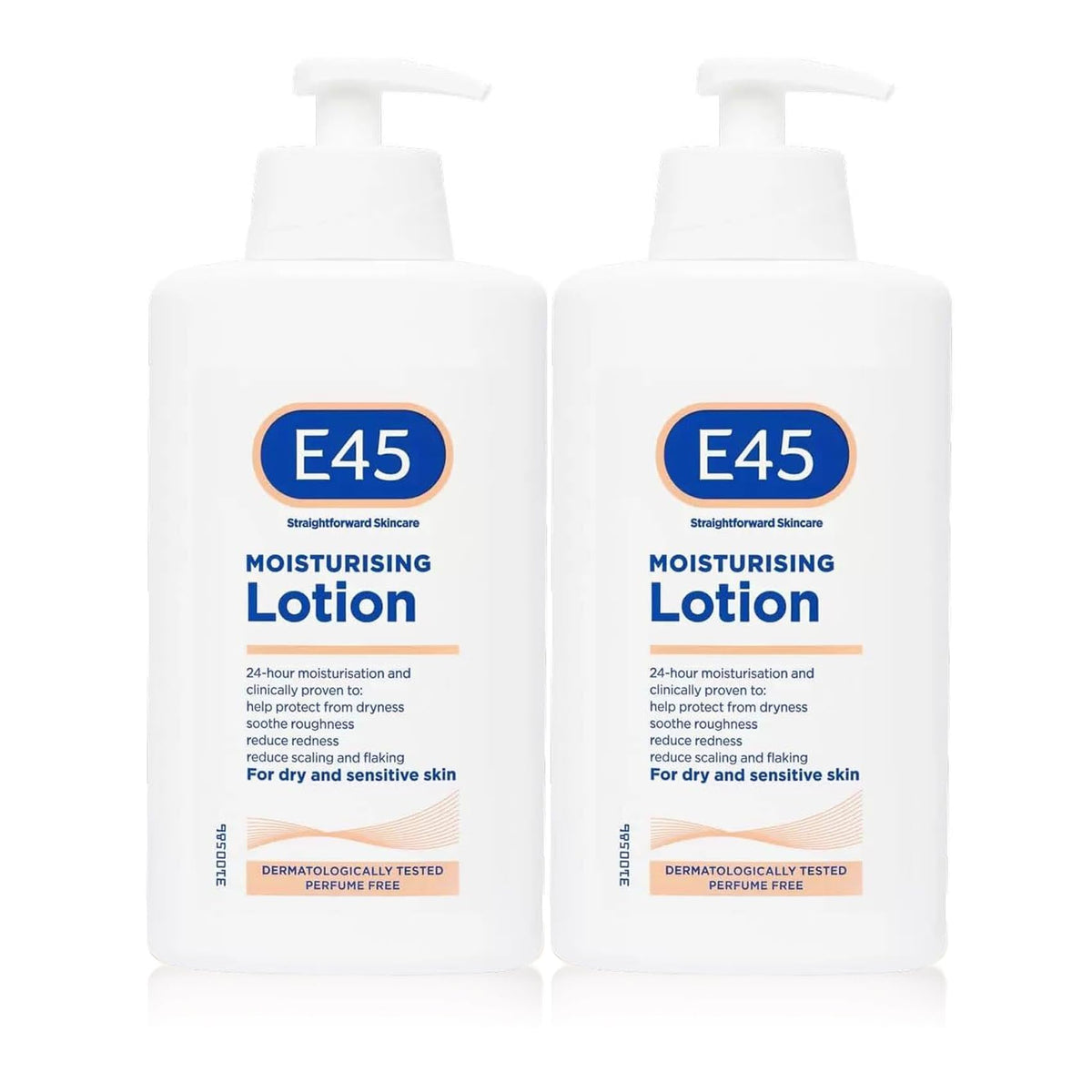 Hydrate and nourish your skin with E45 Dermatological Moisturising Lotion. This pack of 2 lotions provides deep moisturization for dry skin, leaving it soft and smooth.