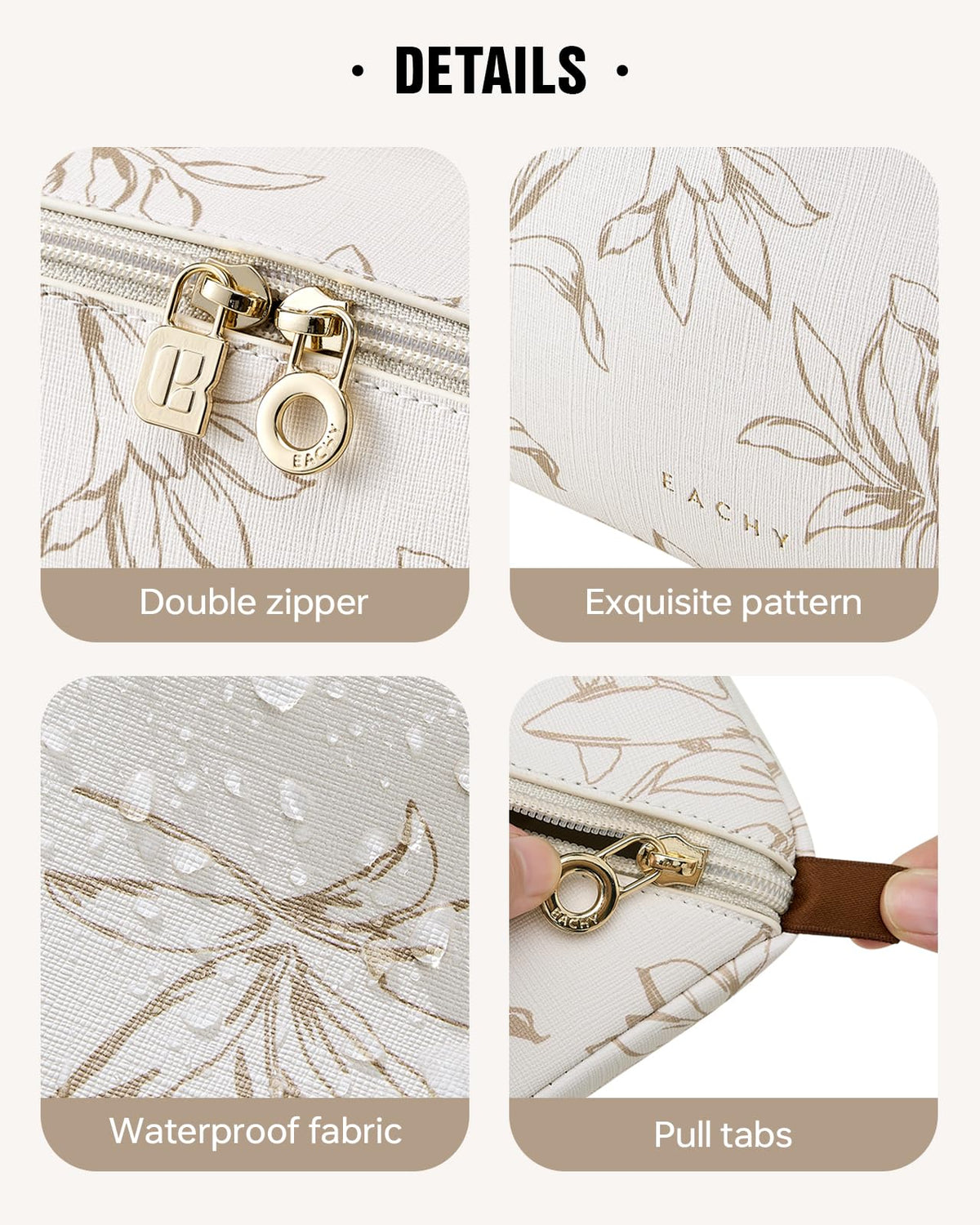 Organize your makeup essentials with EACHY Travel Makeup Bag. This large capacity cosmetic bag in F-Beige pattern opens flat for easy access to your beauty products, making it a must-have for travel and daily use.