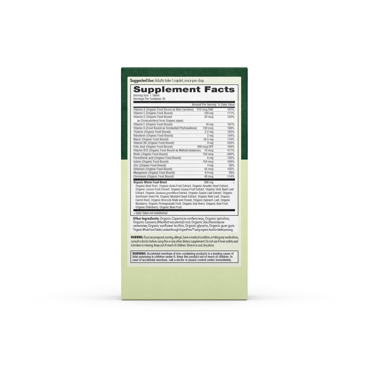 Ingredients :: Vitamin A, Vitamin C, Vitamin D, Vitamin E, Vitamin K, Thiamin, Roboflavin, Niacin, Vitamin B6, Folic Acid, Vitamin B12, Biotin, Pantothenic acid, Iodine, Zinc, Selenium, Manganese, Chromium. Other ingredients: Organic Beet Root, Organic Amla Fruit Extract, Organic Annatto Seed Extract, Organic Lemon Fruit Extract, Organic Guava Fruit Extract, Organic Holy Basil Leaf Extract, Organic Sesbania grandiflora Extract, Organic Guava Leaf Extract, Organic Sunflower Seed Oil, Organic Mustard Seed Extract, Organic Kale Leaf, Organic Carrot Root, Organic Broccoli Stalk and Flower, Organic Spinach Leaf, Organic Blueberry, Organic Pomegranate Fruit, Organic Goji Berry, Organic Acai Fruit, Organic Elderberry, Organic Noni Fruit.