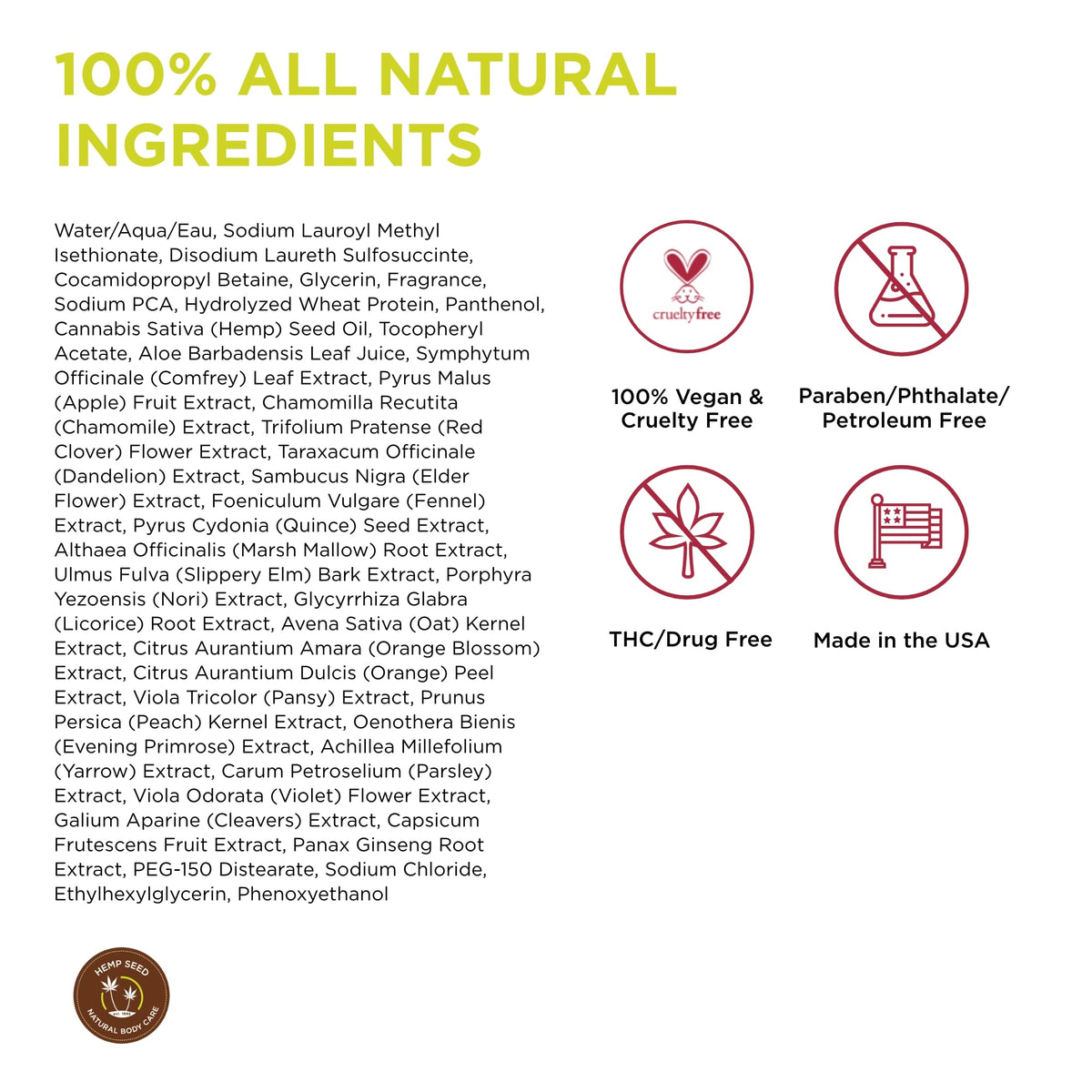 Ingredients: WaterAquaEau, Sodium Lauroyl Methyl Isethionate, Disodium Laureth Sulfosuccinte, Cocamidopropyl Betaine, Glycerin, Fragrance, Sodium PCA, Hydrolyzed Wheat Protein, Panthenol, Cannabis Sativa Hemp Seed Oil, Tocopheryl Acetate, Aloe Barbadensis Leaf Juice, Symphytum Officinale Comfrey Leaf Extract, Pyrus Malus Apple Fruit Extract, Chamomilla Recutita Chamomile Extract, Trifolium Pratense Red Clover Flower Extract, Taraxacum Officinale Dandelion Extract, Sambucus Nigra Elder Flower Extract, Foeniculum Vulgare Fennel Extract, Pyrus Cydonia Quince Seed Extract, Althaea Officinalis Marsh Mallow Root Extract, Ulmus Fulva Slippery Elm Bark Extract, Porphyra Yezoensis Nori Extract, Glycyrrhiza Glabra Licorice Root Extract, Avena Sativa Oat Kernel Extract, Citrus Aurantium Amara Orange Blossom Extract, Citrus Aurantium Dulcis Orange Peel Extract, Viola Tricolor Pansy Extract, Prunus Persica Peach Kernel Extract, Oenothera Bienis Evening Primrose Extract, Achillea Millefolium Yarrow Extract, Carum Petroselium Parsley Extract, Viola Odorata Violet Flower Extract, Galium Aparine Cleavers Extract, Capsicum Frutescens Fruit Extract, Panax Ginseng Root Extract, PEG150 Distearate, Sodium Chloride, Ethylhexylglycerin, Phenoxyethanol