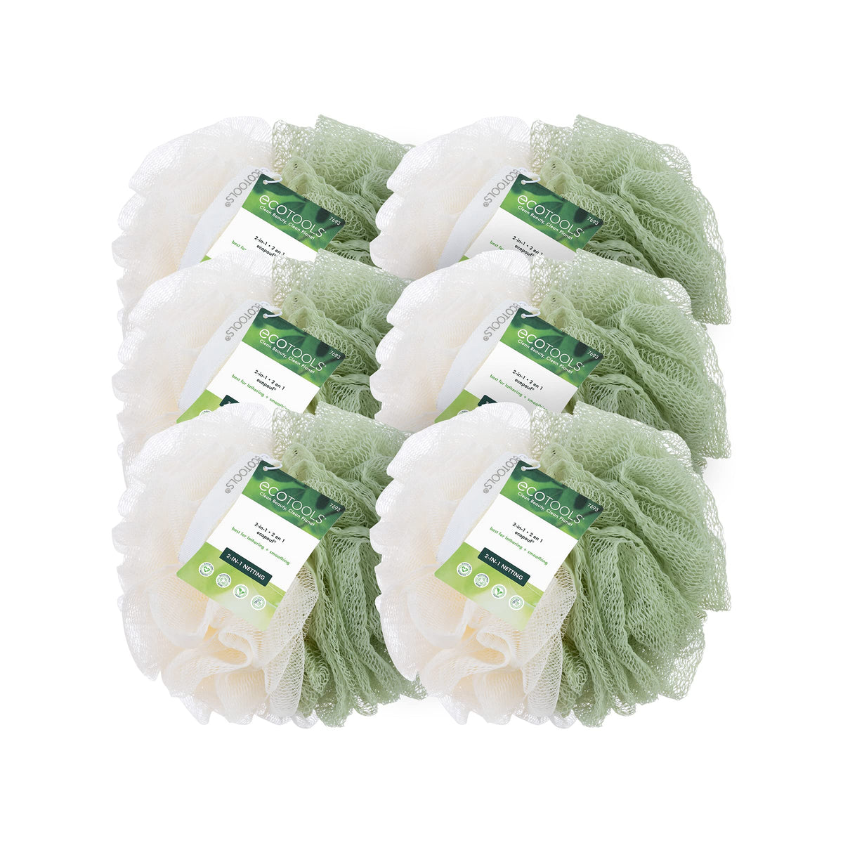 EcoTools Green 2-in-1 EcoPouf, Dual-Sided Shower Loofah Exfoliates & Cleanses Skin, Made of Recycled Netting, Removes Dead Skin, Eco-Friendly Bath Accessory, Cruelty-Free, 6 Count (60g)